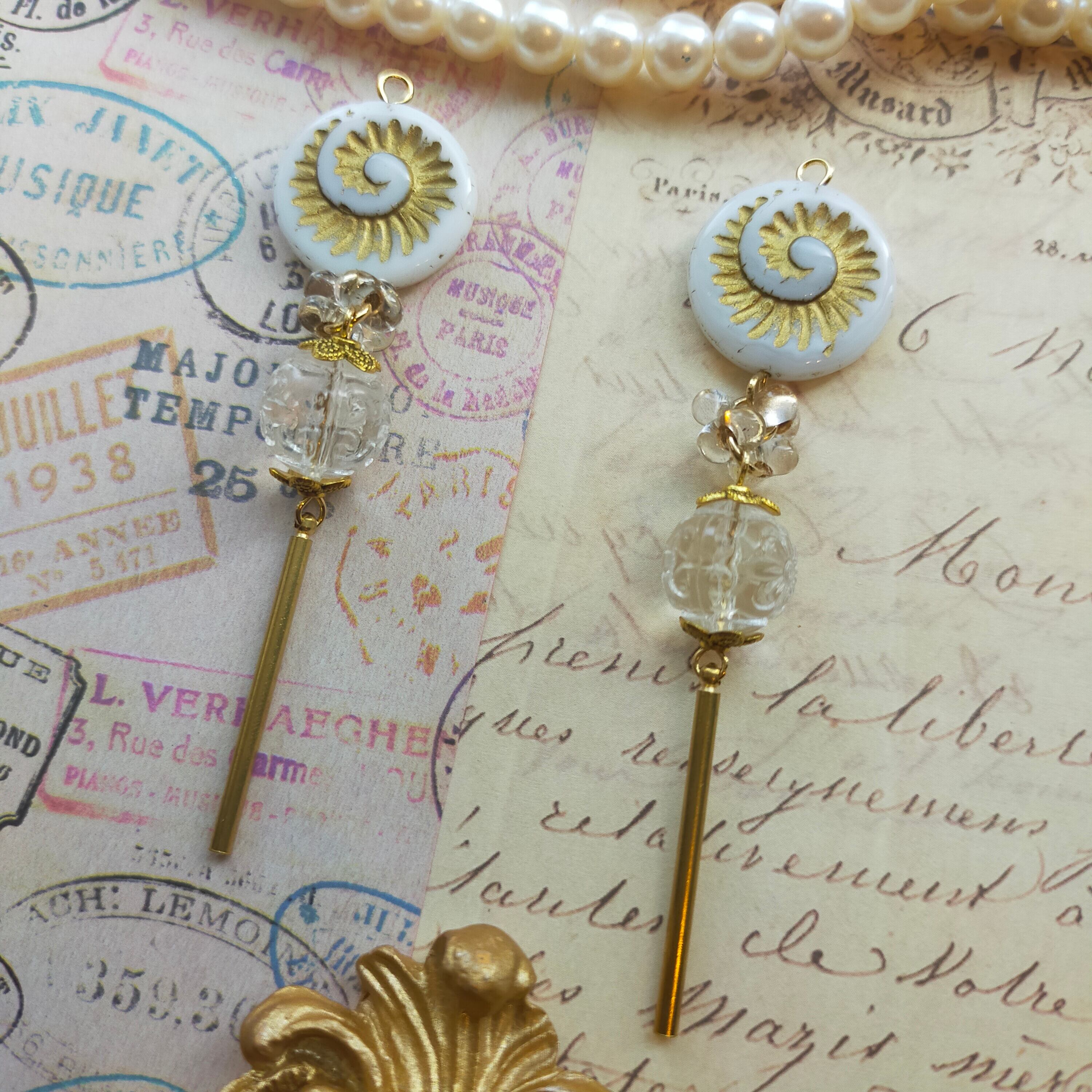 アンモナイトとファルファーレのチェコビーズ、クリアアクリルビーズ、真鍮の棒を使用致しました
