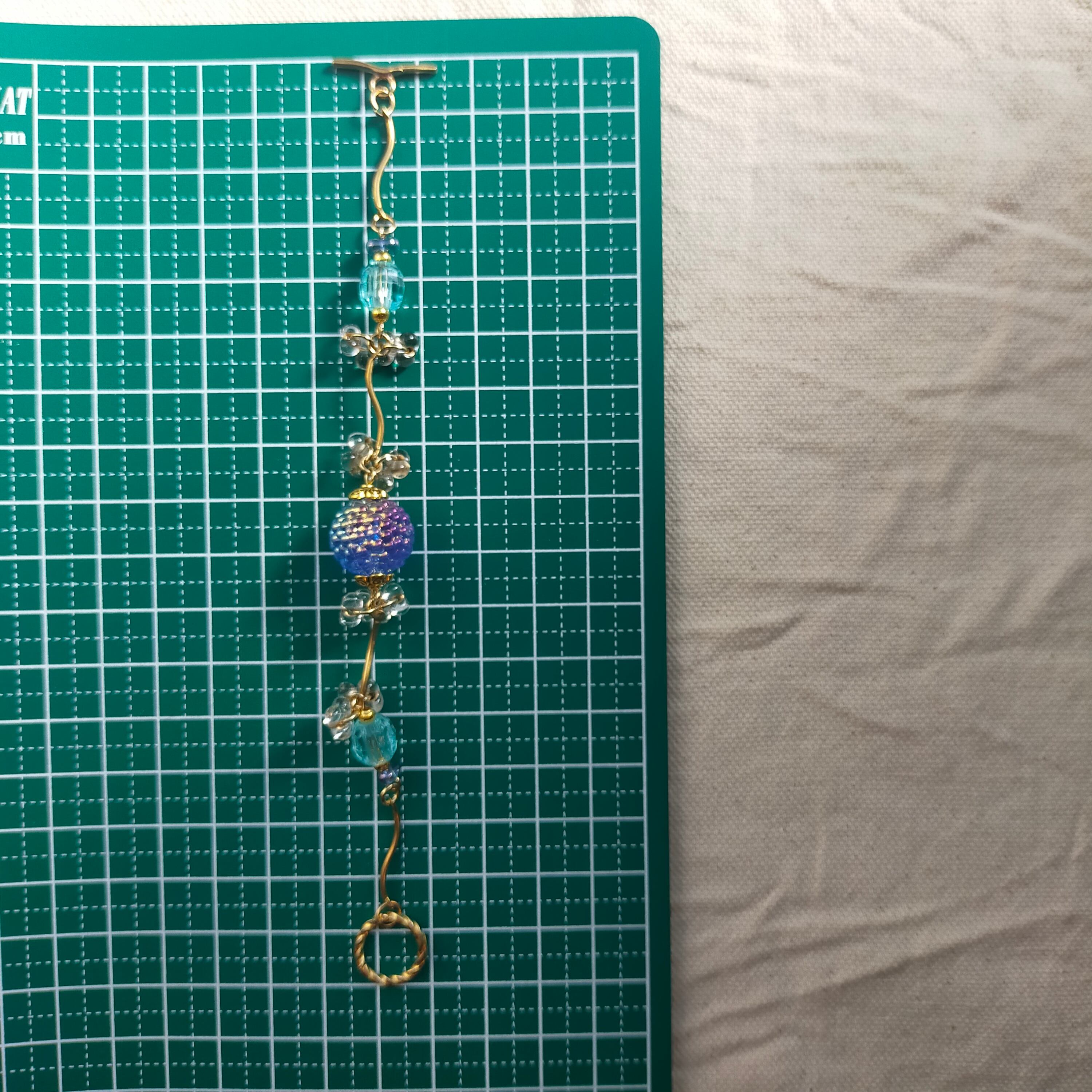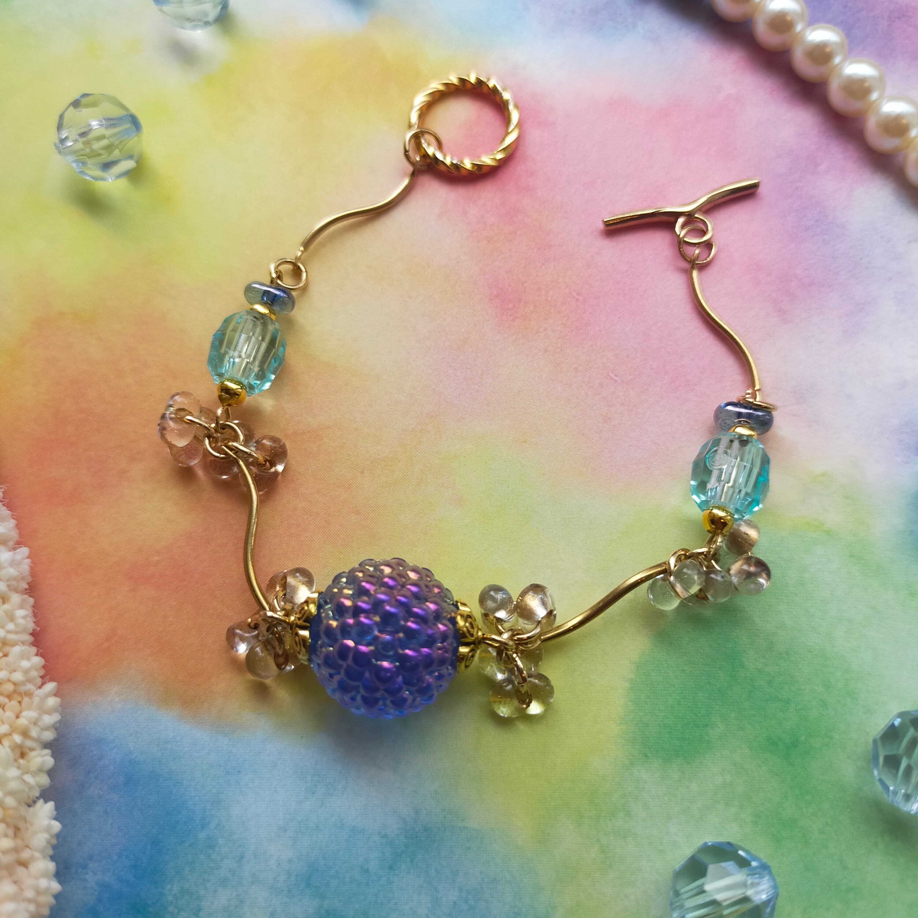 此方はアクリルビーズ、真鍮、金メッキパーツ、ファルファーレチェコビーズを使用しております