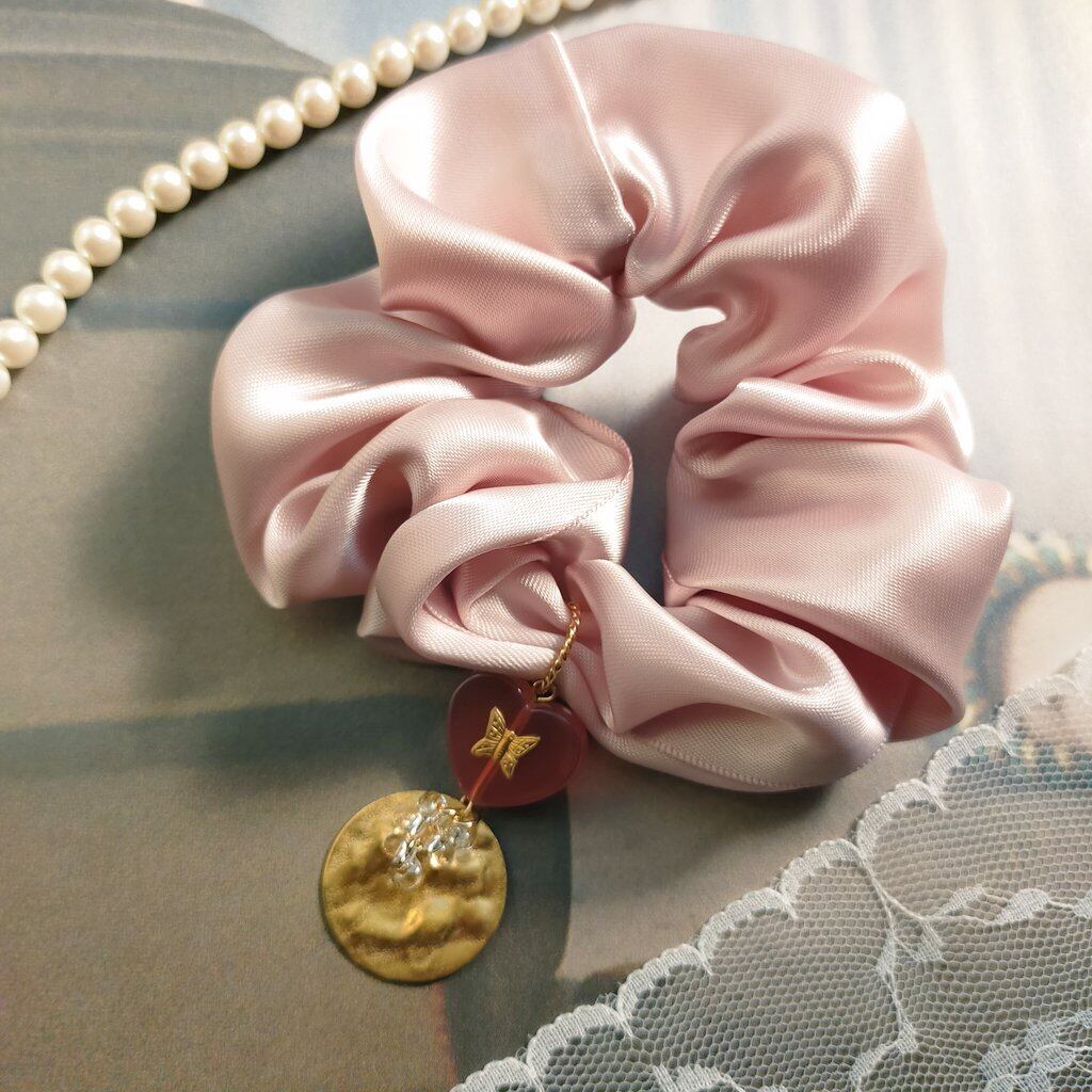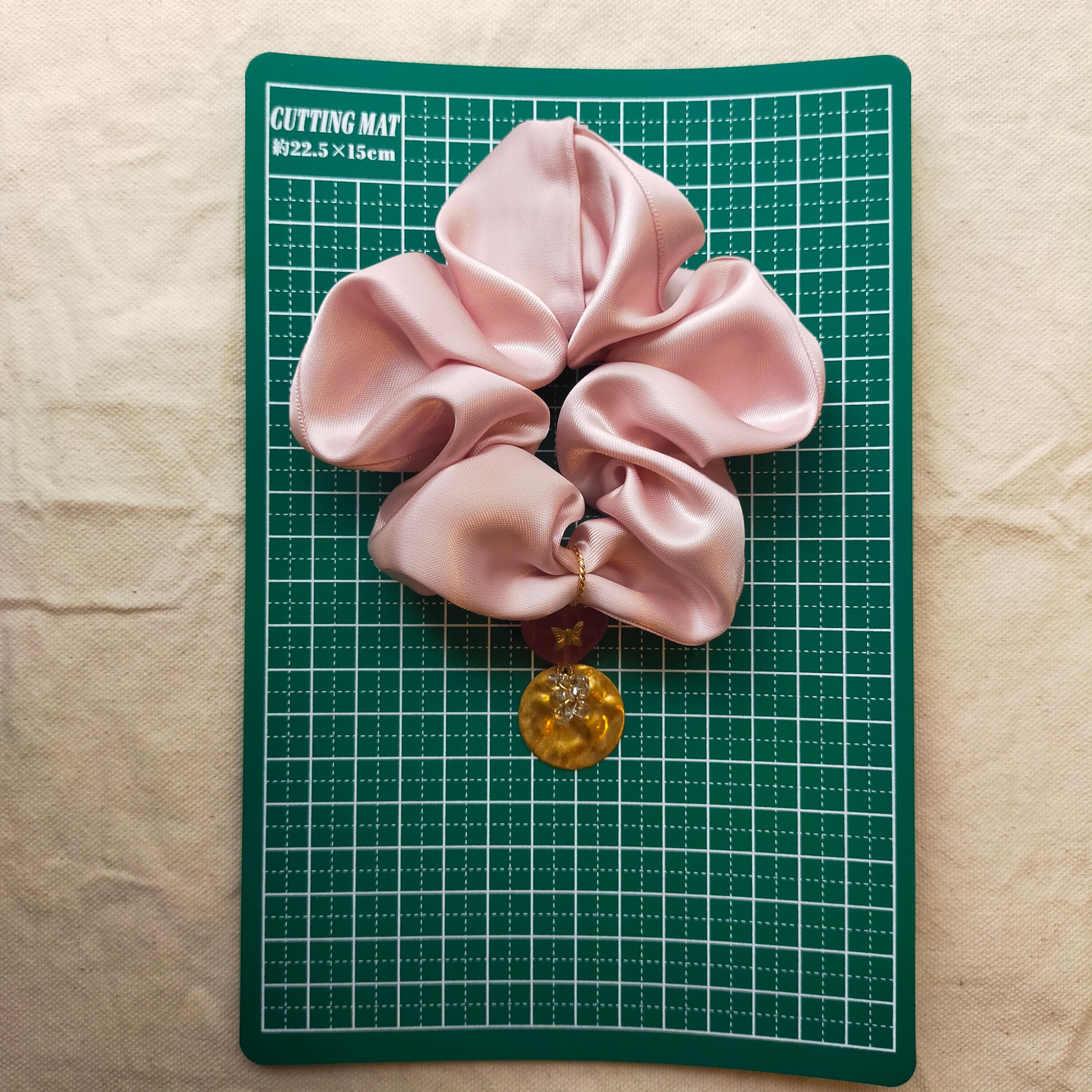 肉厚もっちもちの艶感あるリボンシュシュにアクリルのハートパーツと真鍮の蝶々と円、硝子ビーズを使用したチャームをお付けいたしました▶•◀