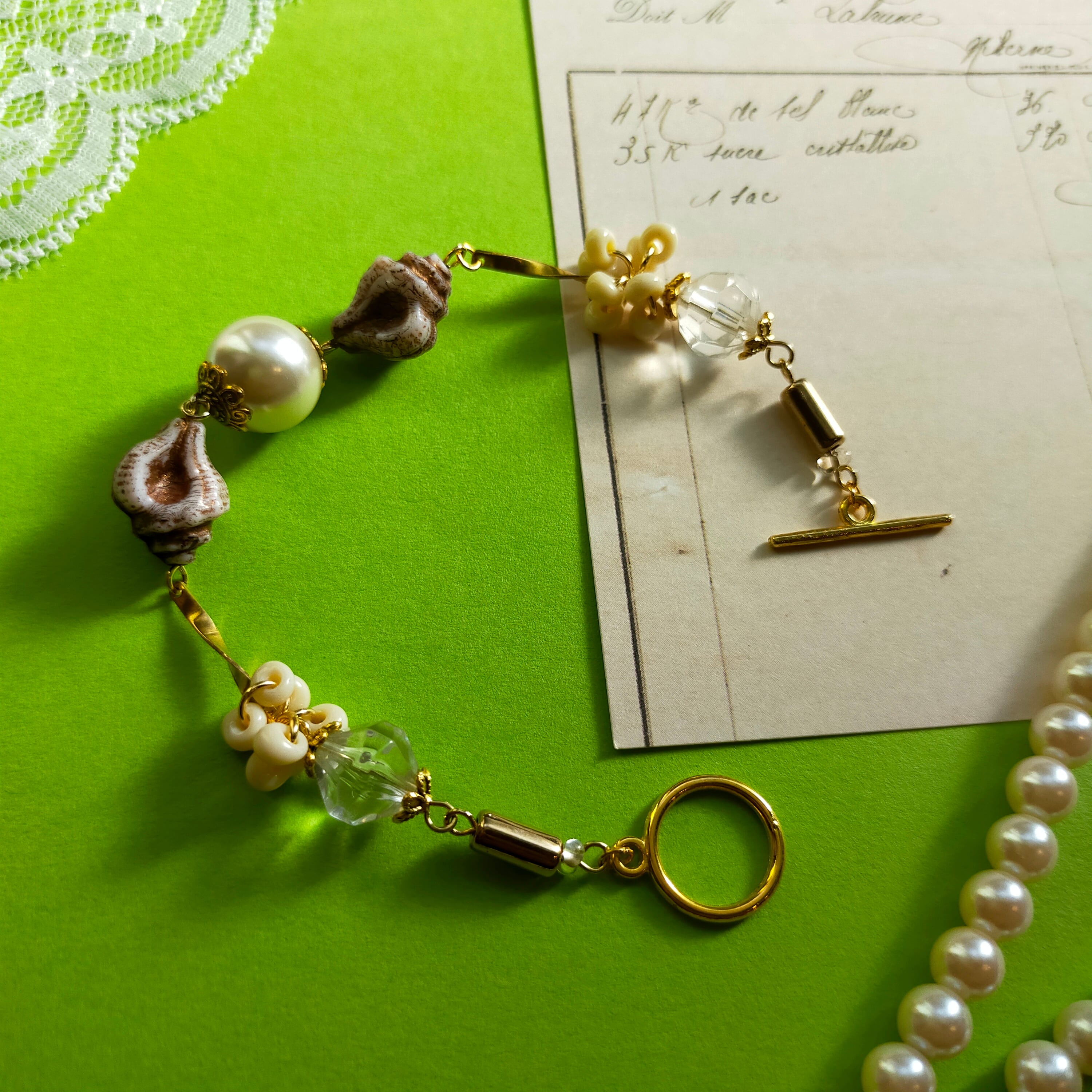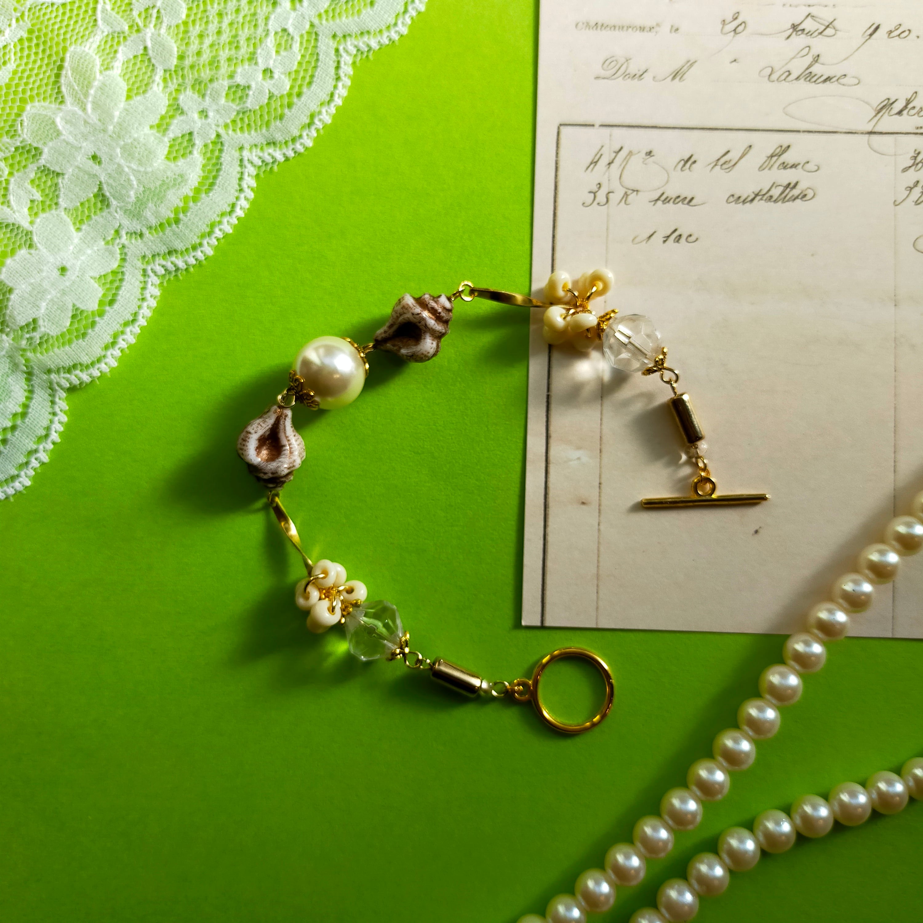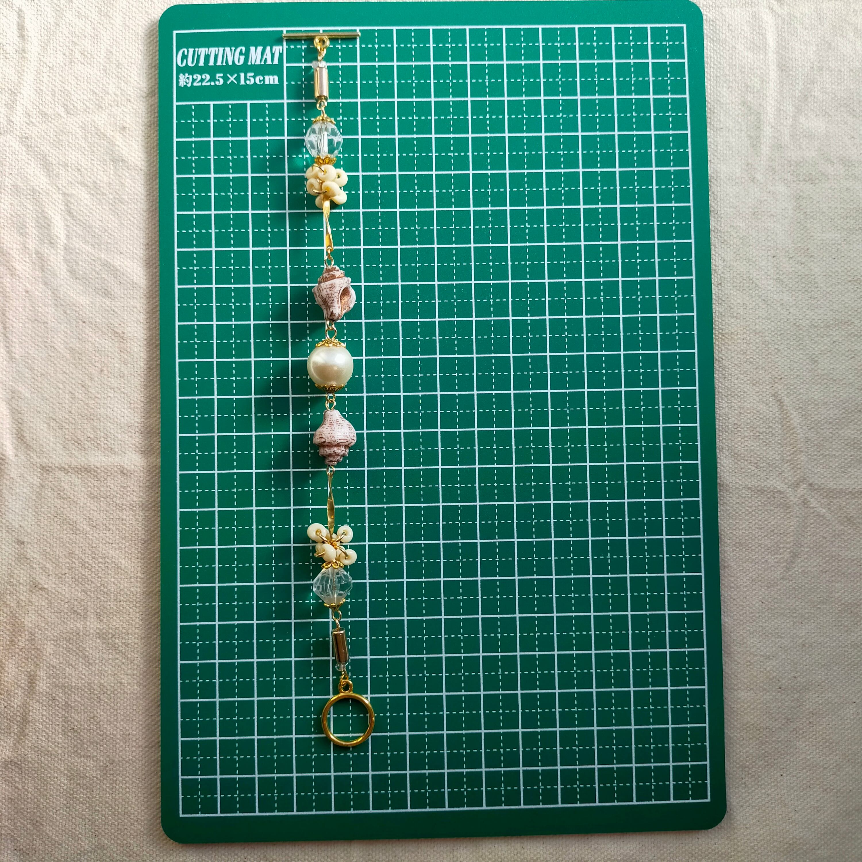 此方は勾玉ビーズ、japan vintageの樹脂パール、アクリルビーズ、チェコビーズ、金メッキのパーツを使用しております。