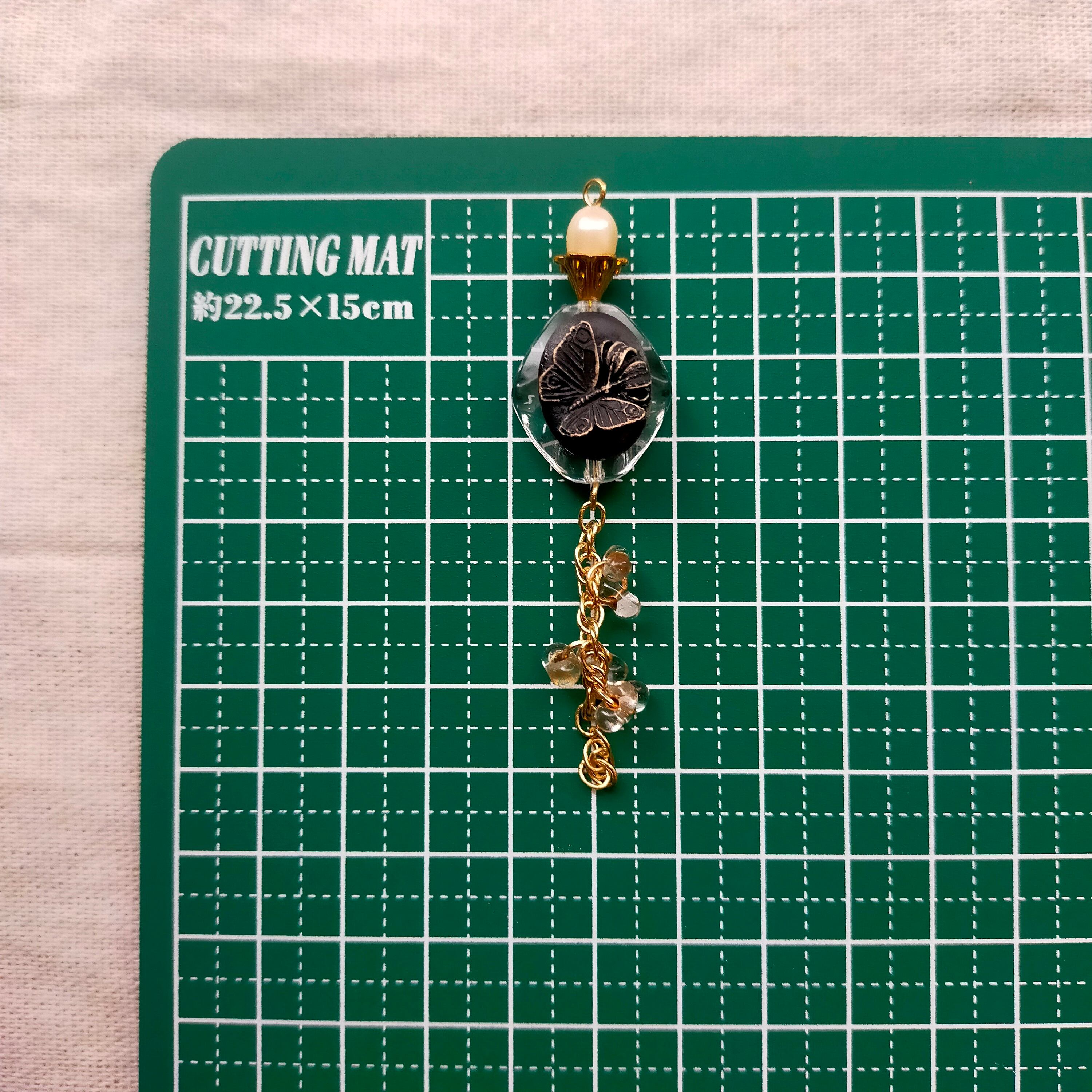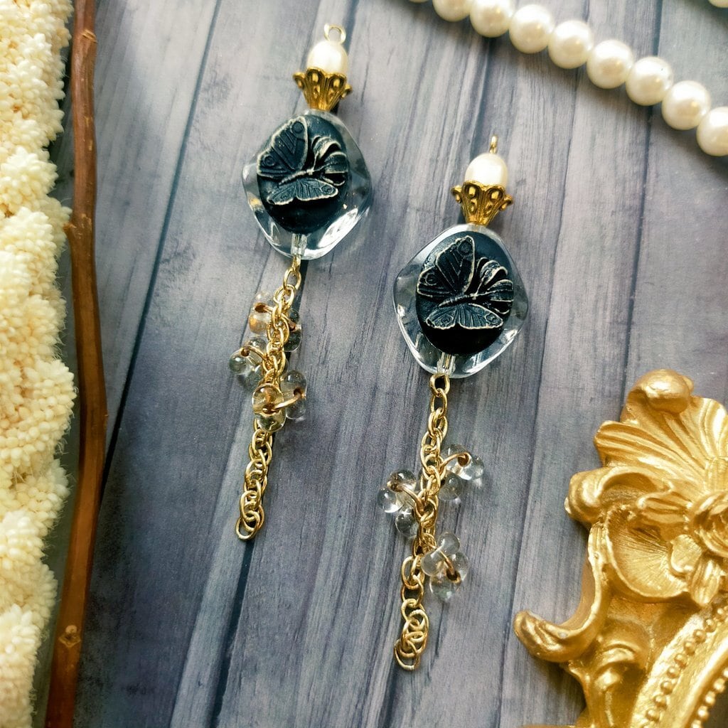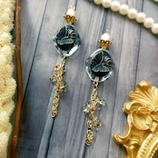 此方は硝子パーツ、japan vintageの樹脂パール、金属パーツ、アクリルパーツ、真鍮のチェーンを使用した耳飾りでございます