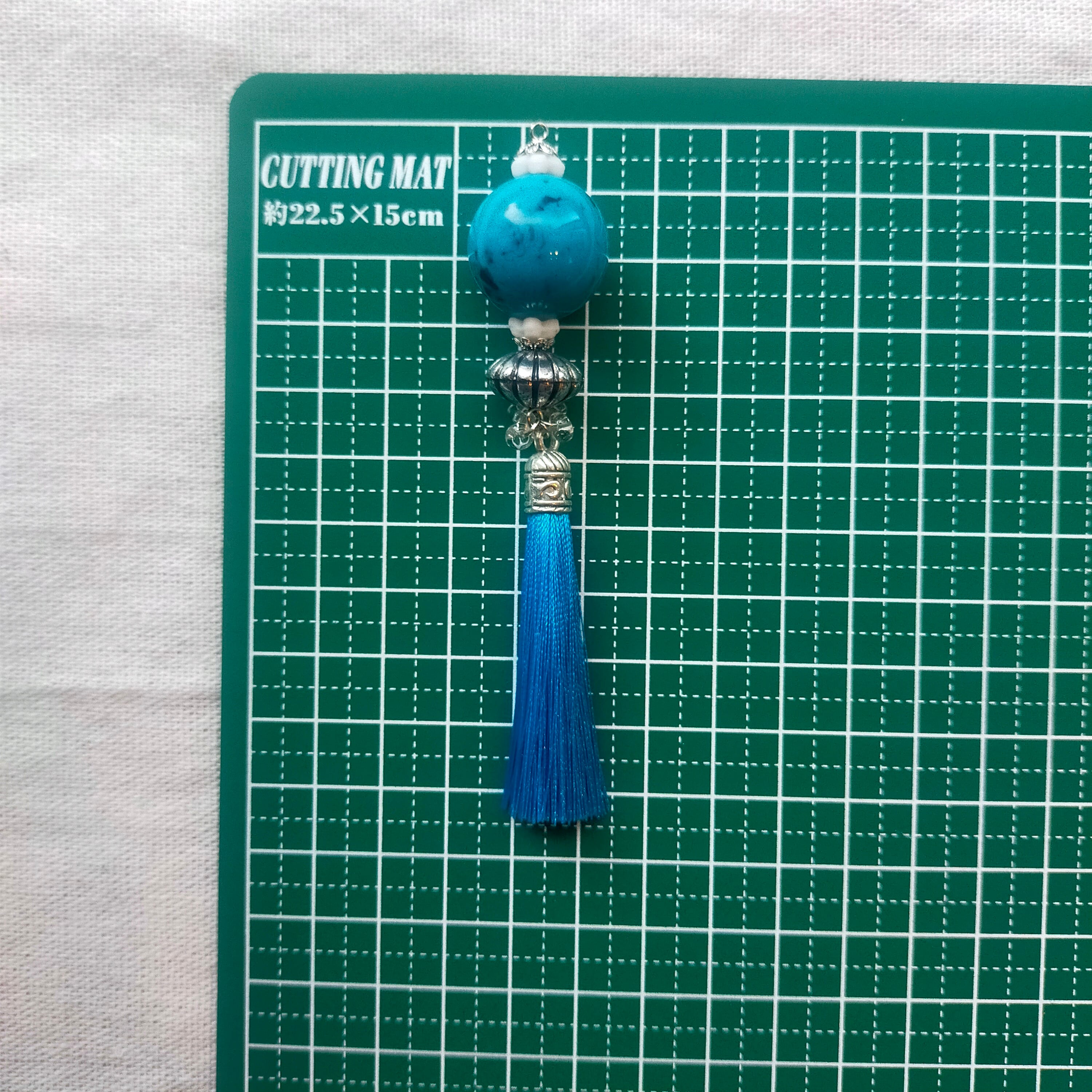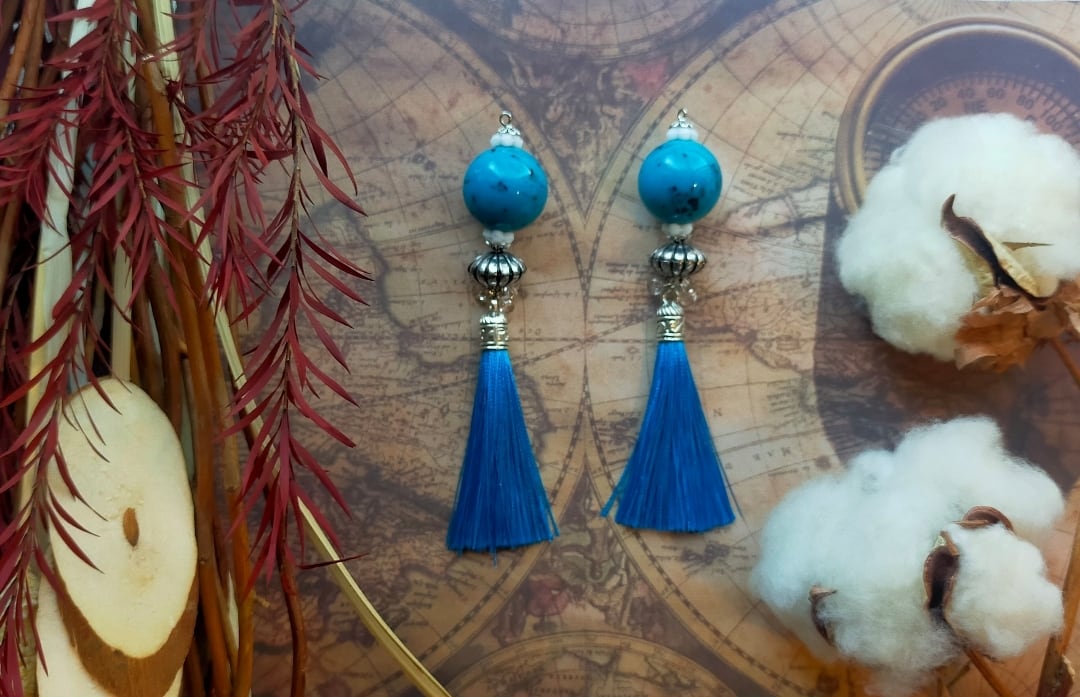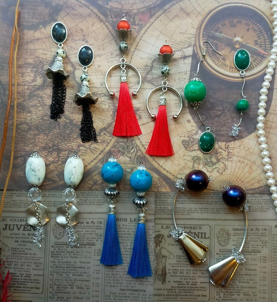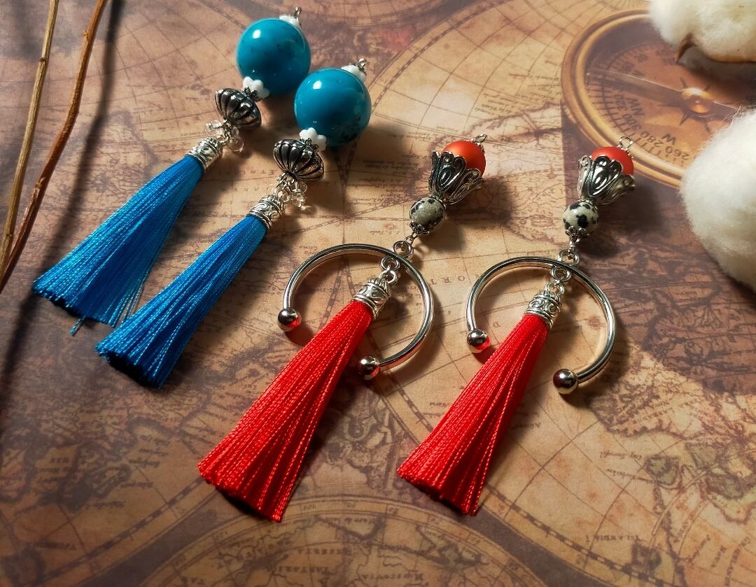 此方は硝子ビーズ、ステンレス製パーツ、アクリルビーズ、TOHOビーズさんの勾玉ビーズ、タッセルを使用した耳飾りでございます。
