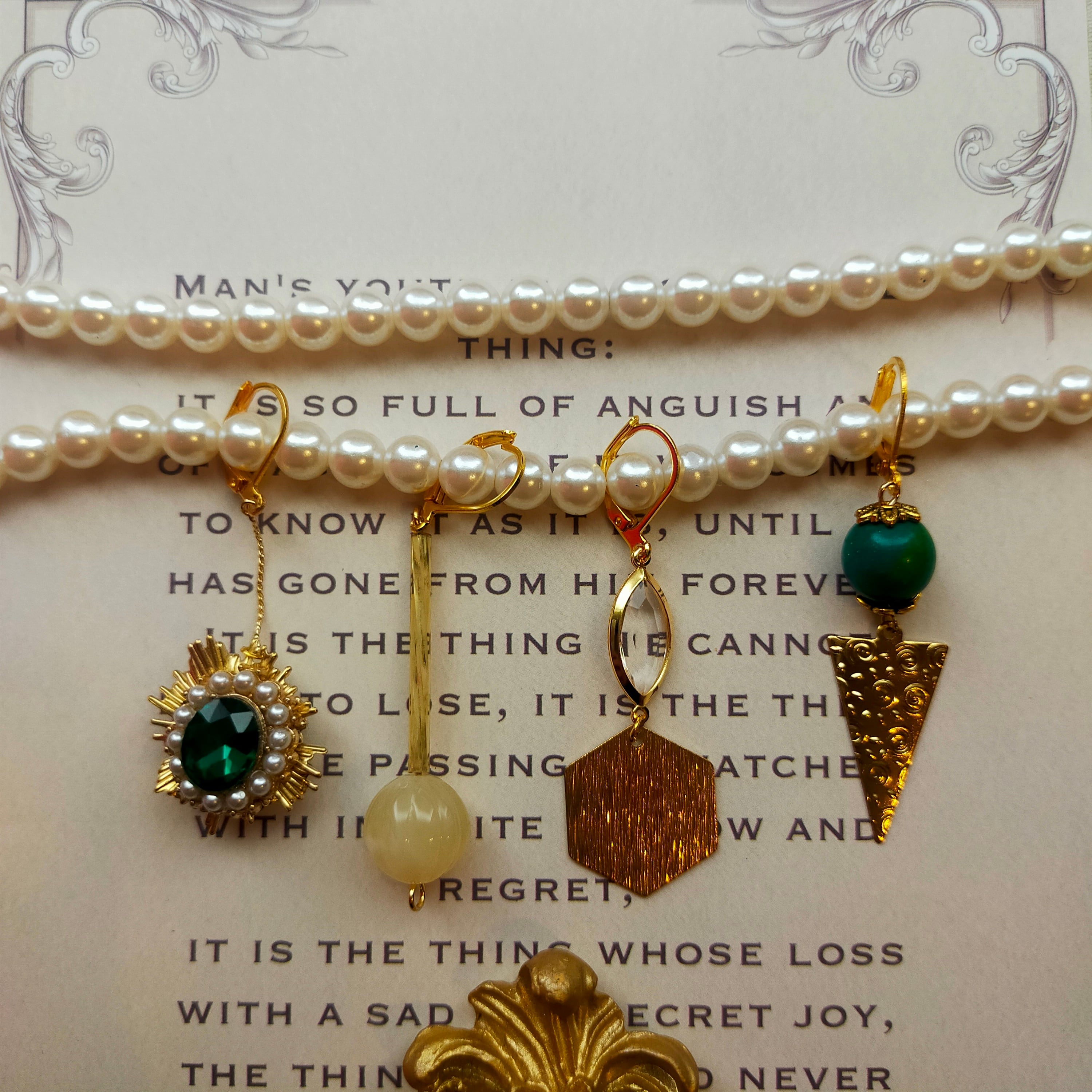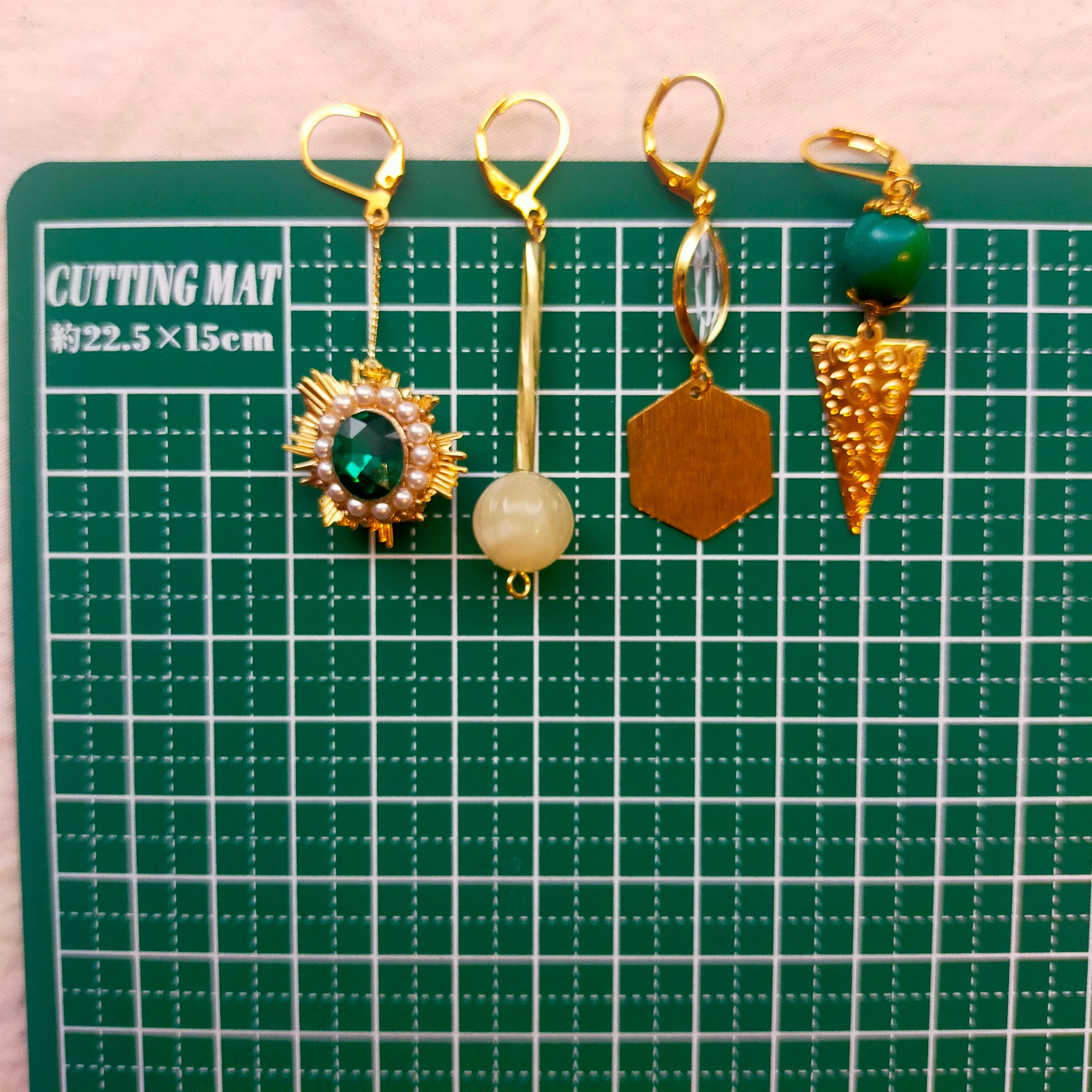 此方は真鍮、ビジュー、チェコビーズ、アクリルビーズ、硝子パーツ、翡翠のビーズを使用した4点セットの耳飾りでございます。