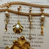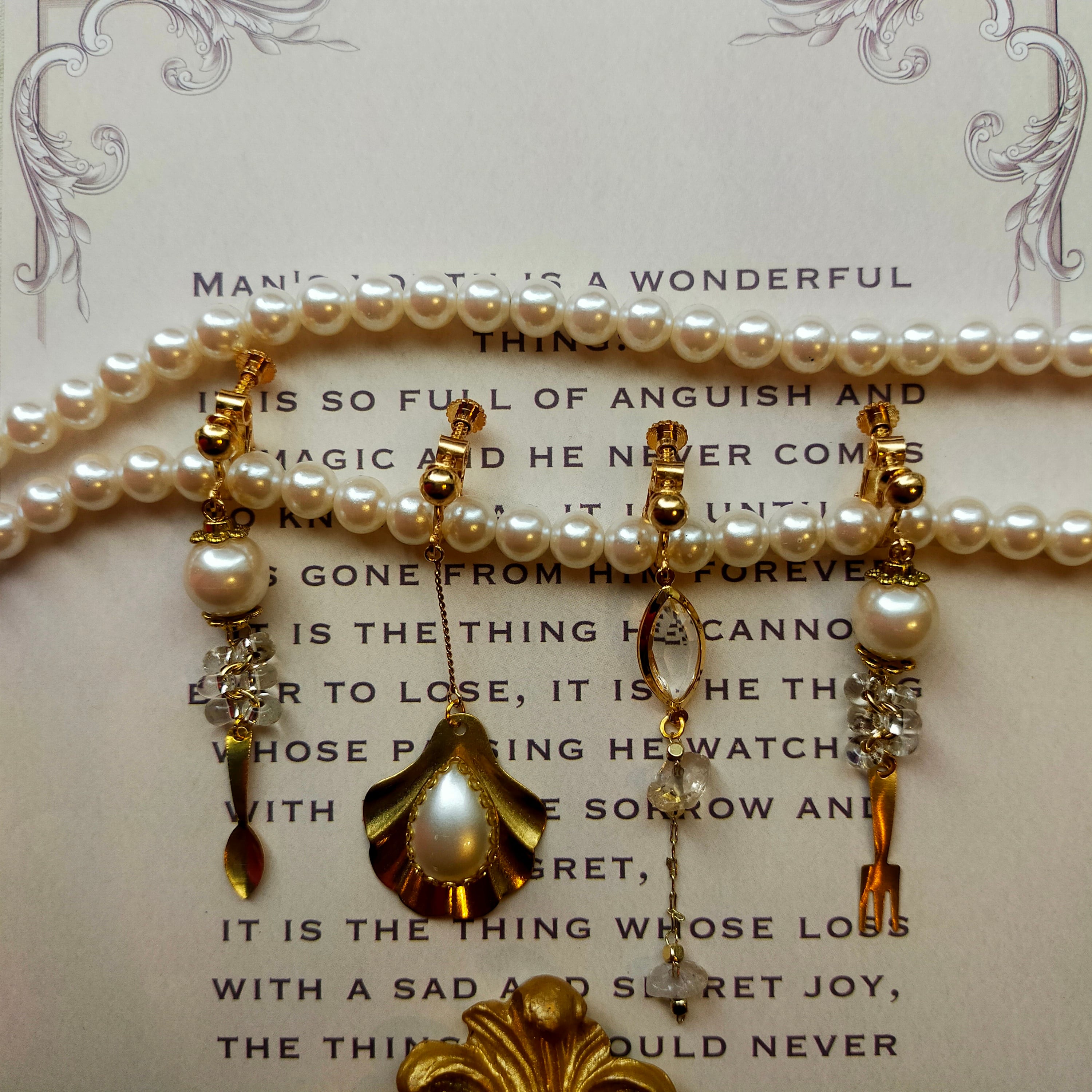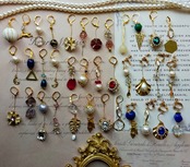 此方は真鍮、ビジュー、金属製パーツ、japan vintageの樹脂パール、硝子パーツ、勾玉ビーズ、天然石チェーンを使用した4点セットの耳飾りでございます。