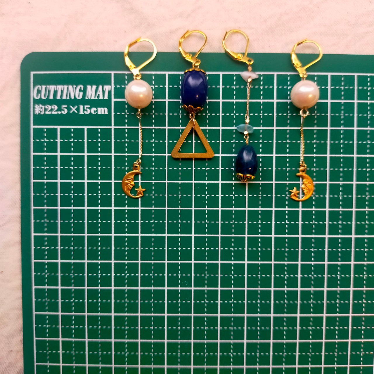 此方は真鍮、japan vintageの樹脂パール、金属製パーツ、アクリルビーズ、天然石チェーンを使用した4点セットの耳飾りでございます。
