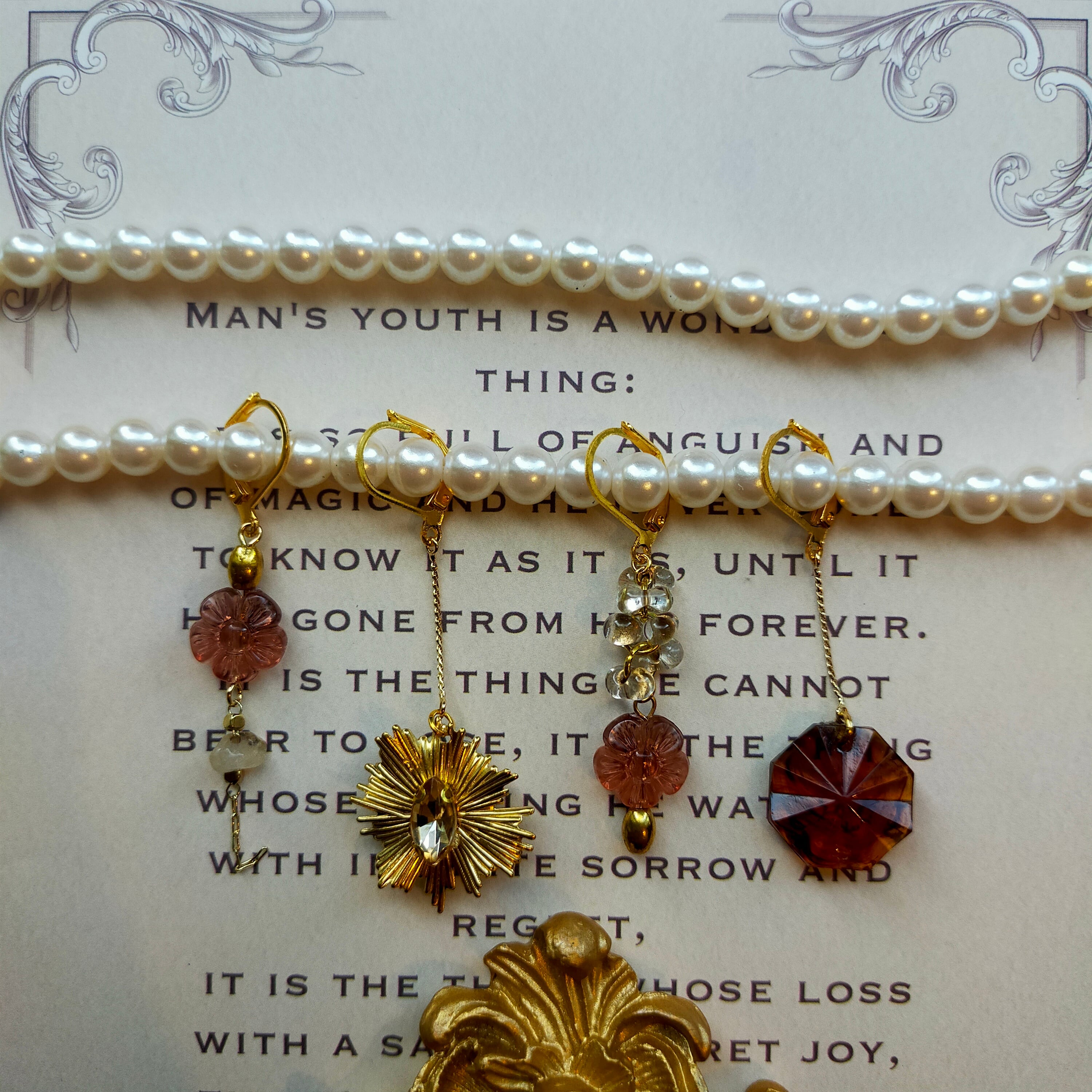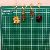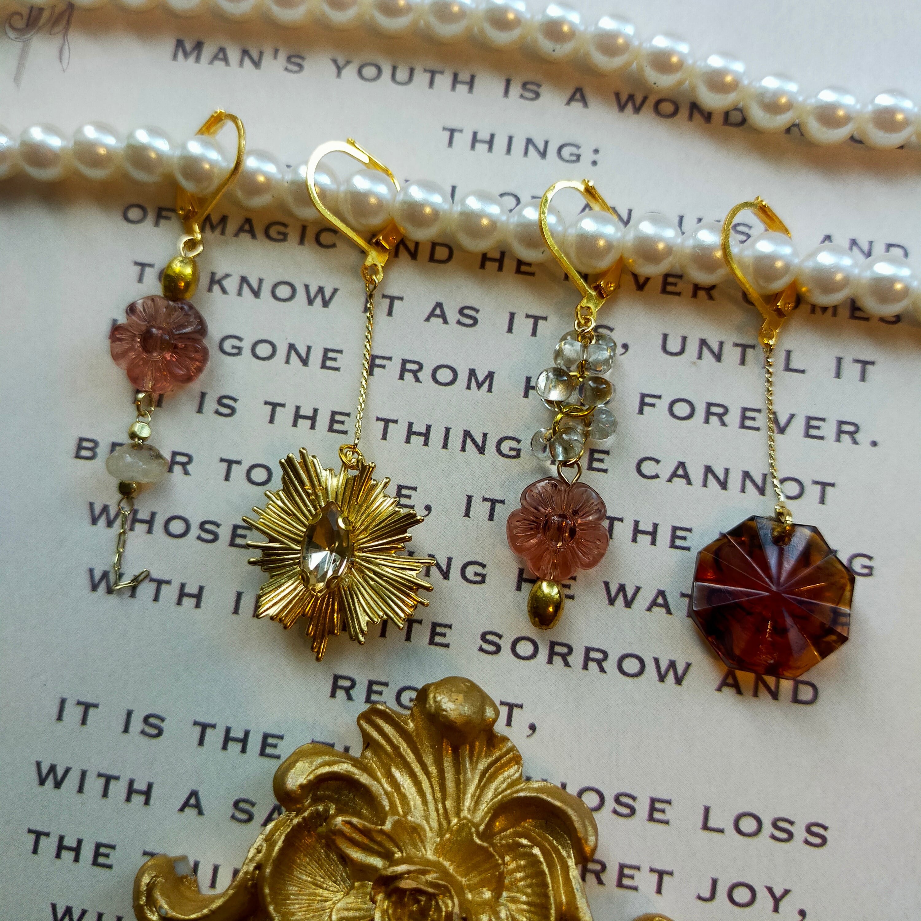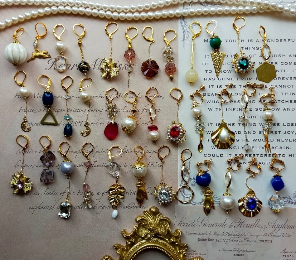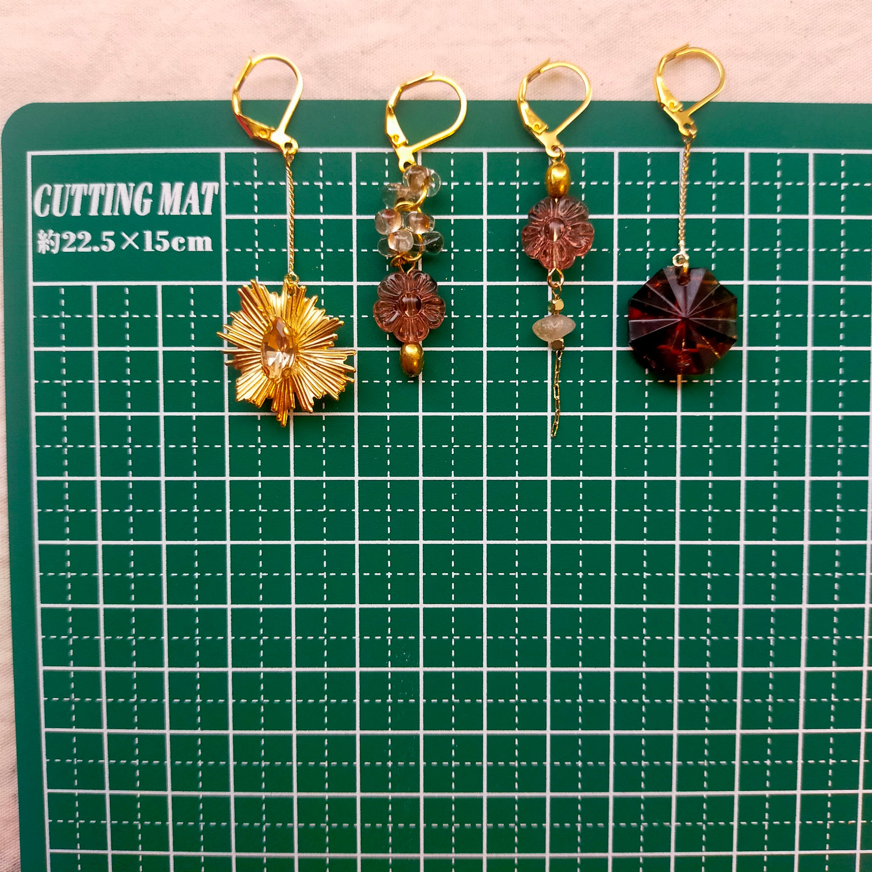 此方は真鍮、ビジュー、アクリルビーズ、硝子ビーズ、天然石チェーンを使用した4点セットの耳飾りでございます。