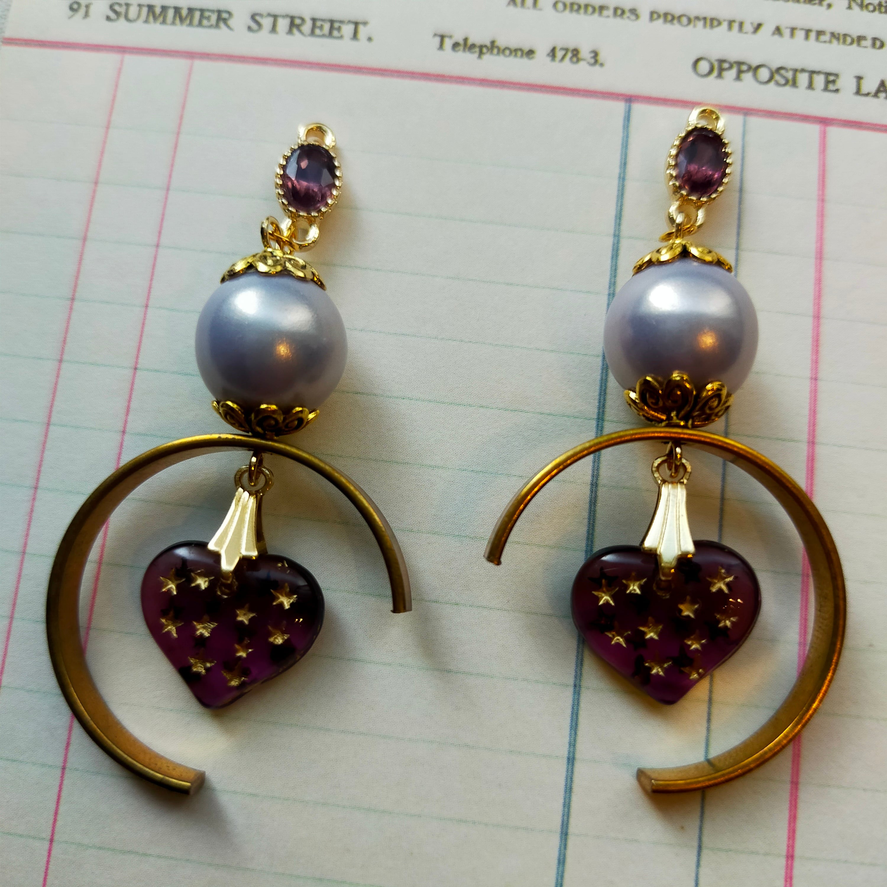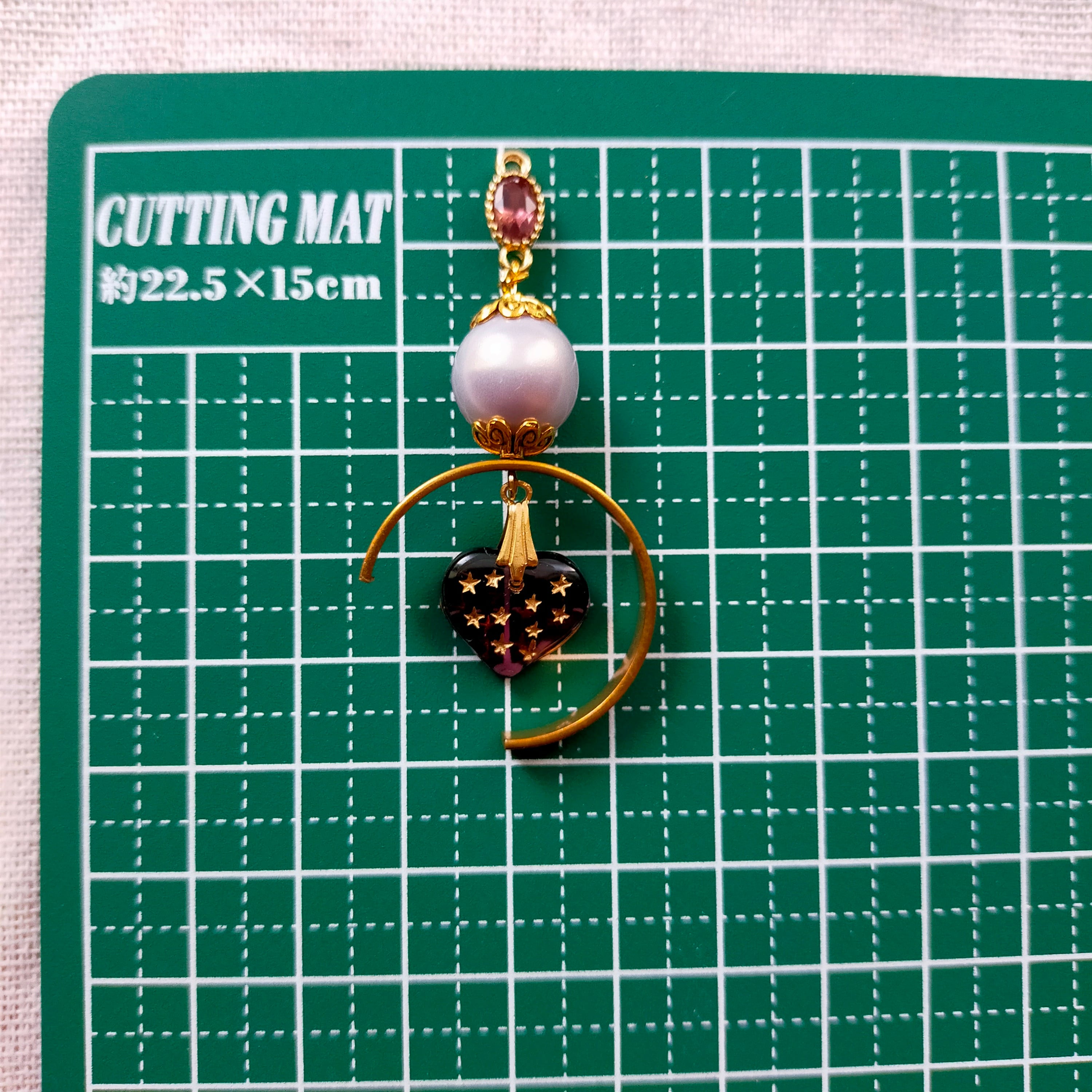 此方は硝子パーツ、japan vintageの樹脂パール、金属製パーツ、チェコビーズ、真鍮を使用した耳飾りでございます。