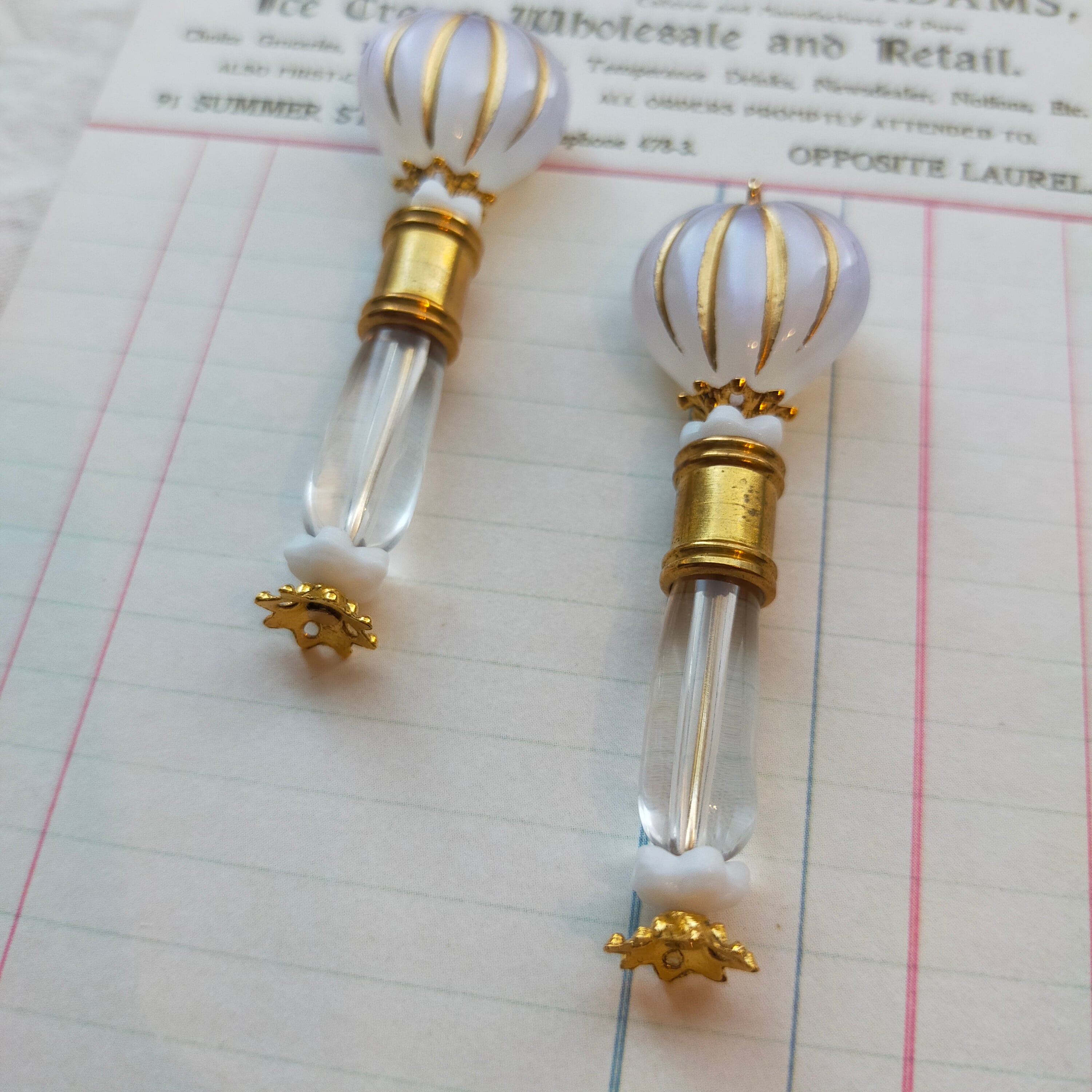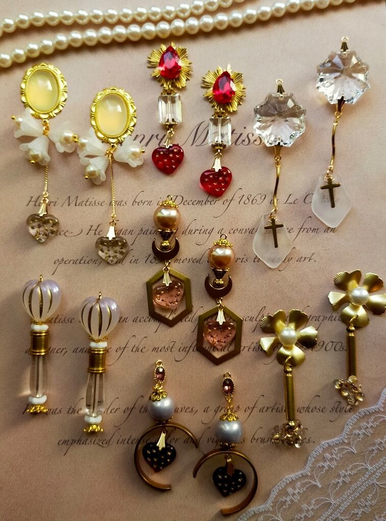 此方はアクリルパーツ、金属製パーツ、チェコビーズ、真鍮を使用した耳飾りでございます。