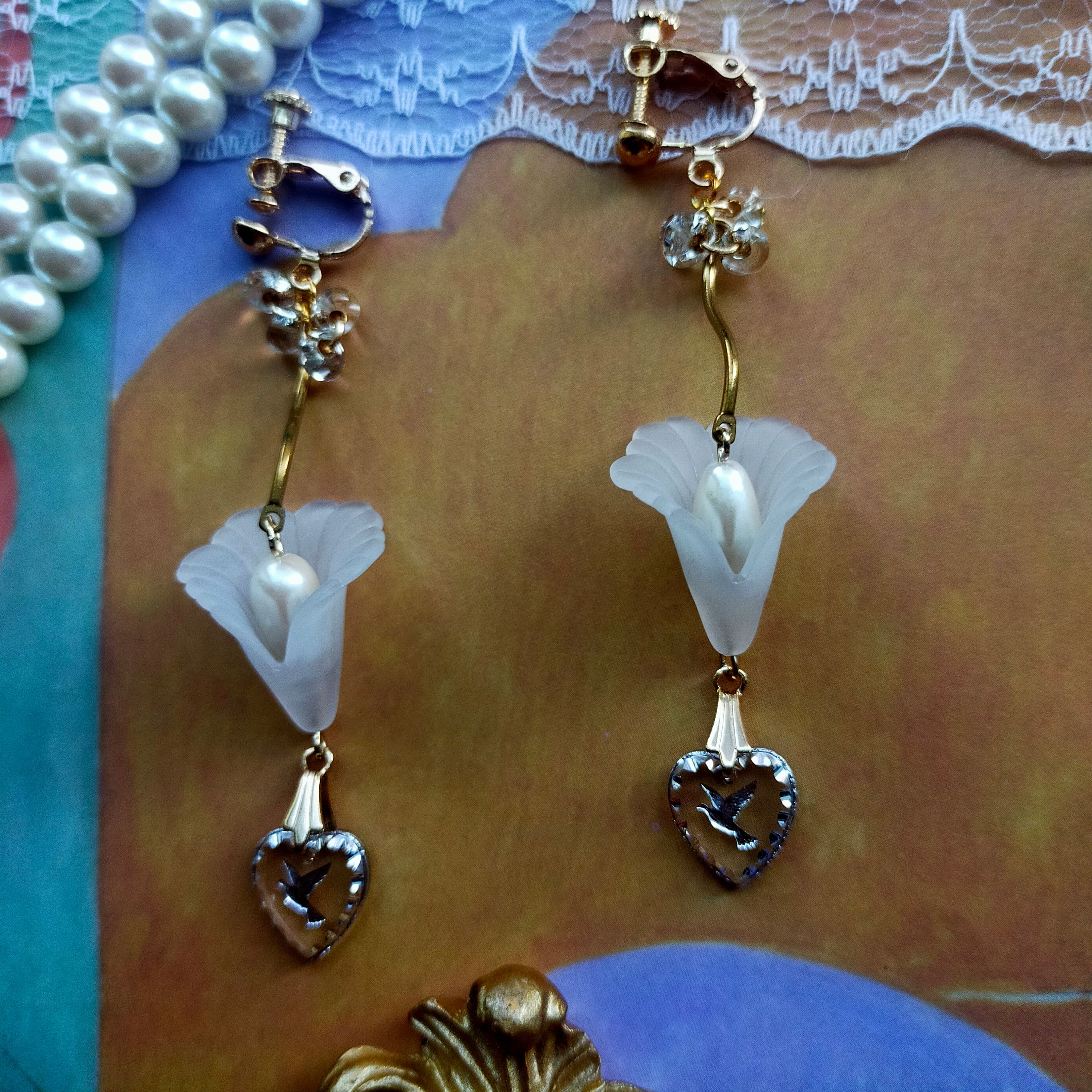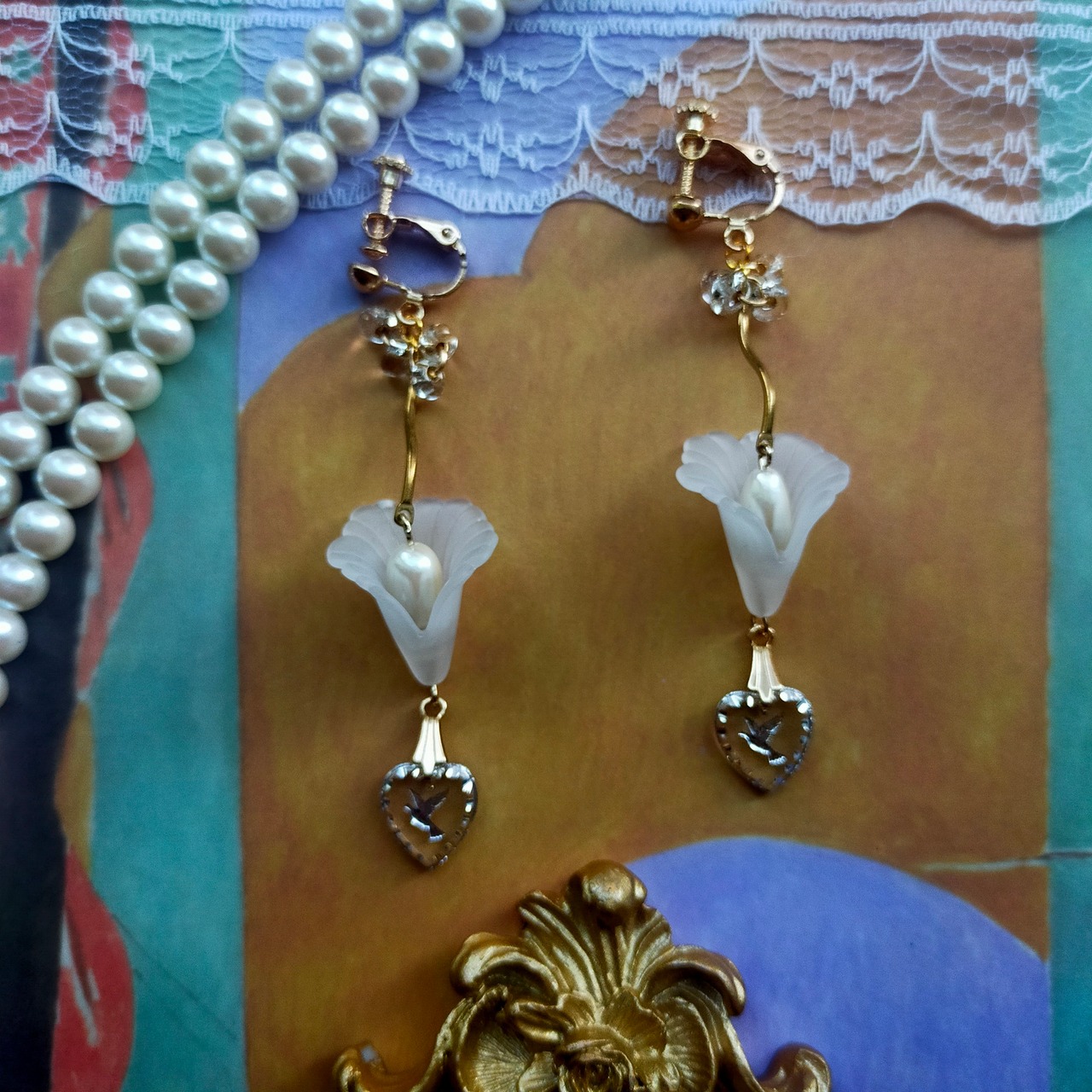 此方は真鍮、アクリルパーツ、japan vintageの樹脂パール、勾玉ビーズ、ドイツ製インタリオを使用した耳飾りです