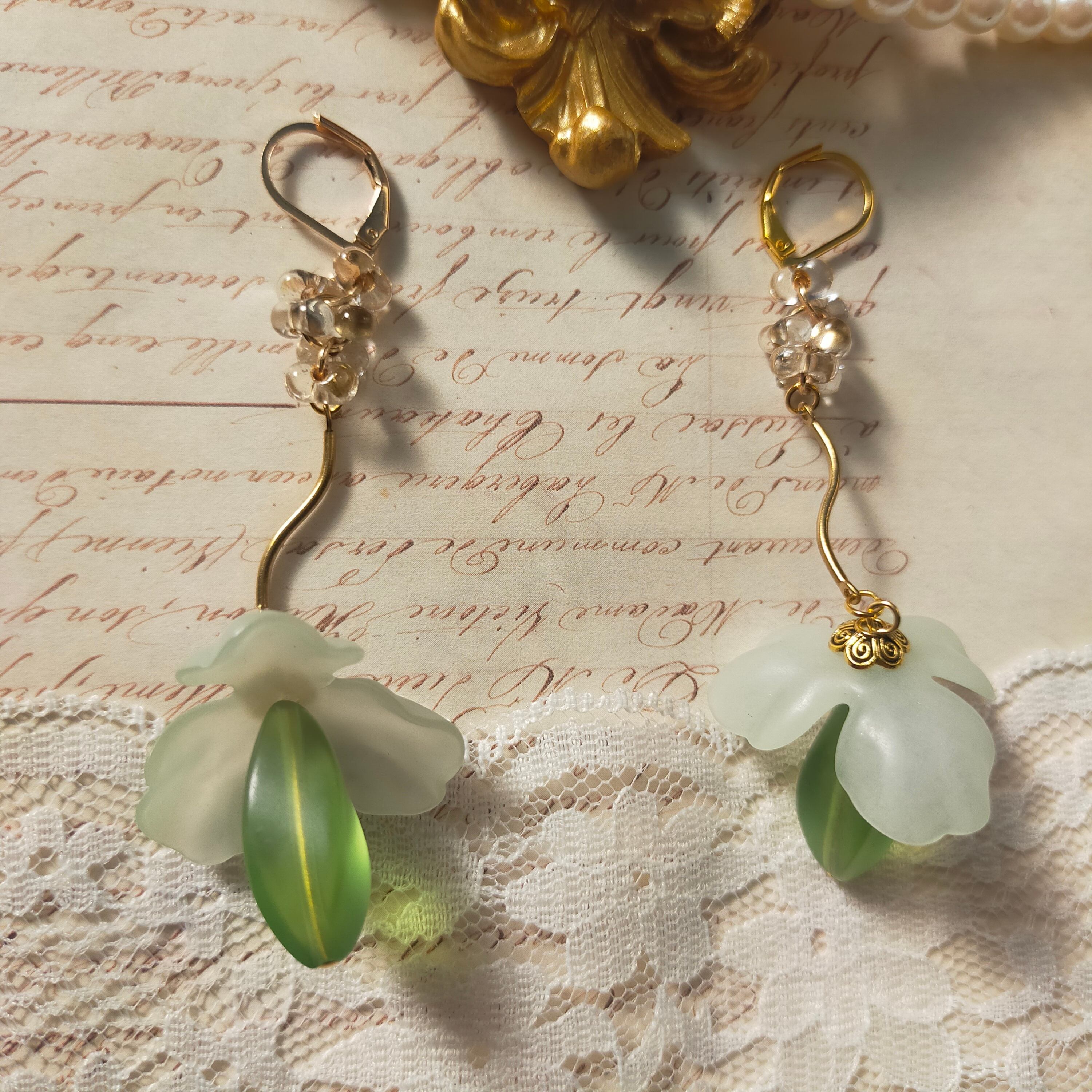 此方はいつもお世話になっている作家さんからお譲り頂いた染めビーズと日本製ビーズ、金属製パーツ、真鍮、硝子ビーズを使用した耳飾りでございます。