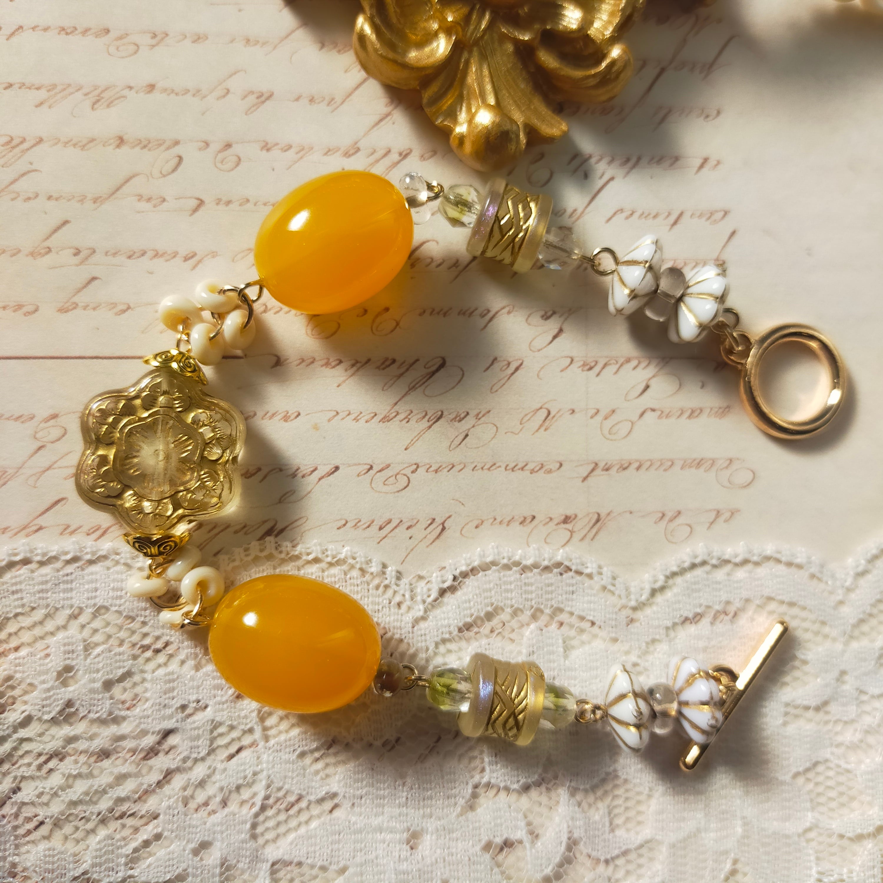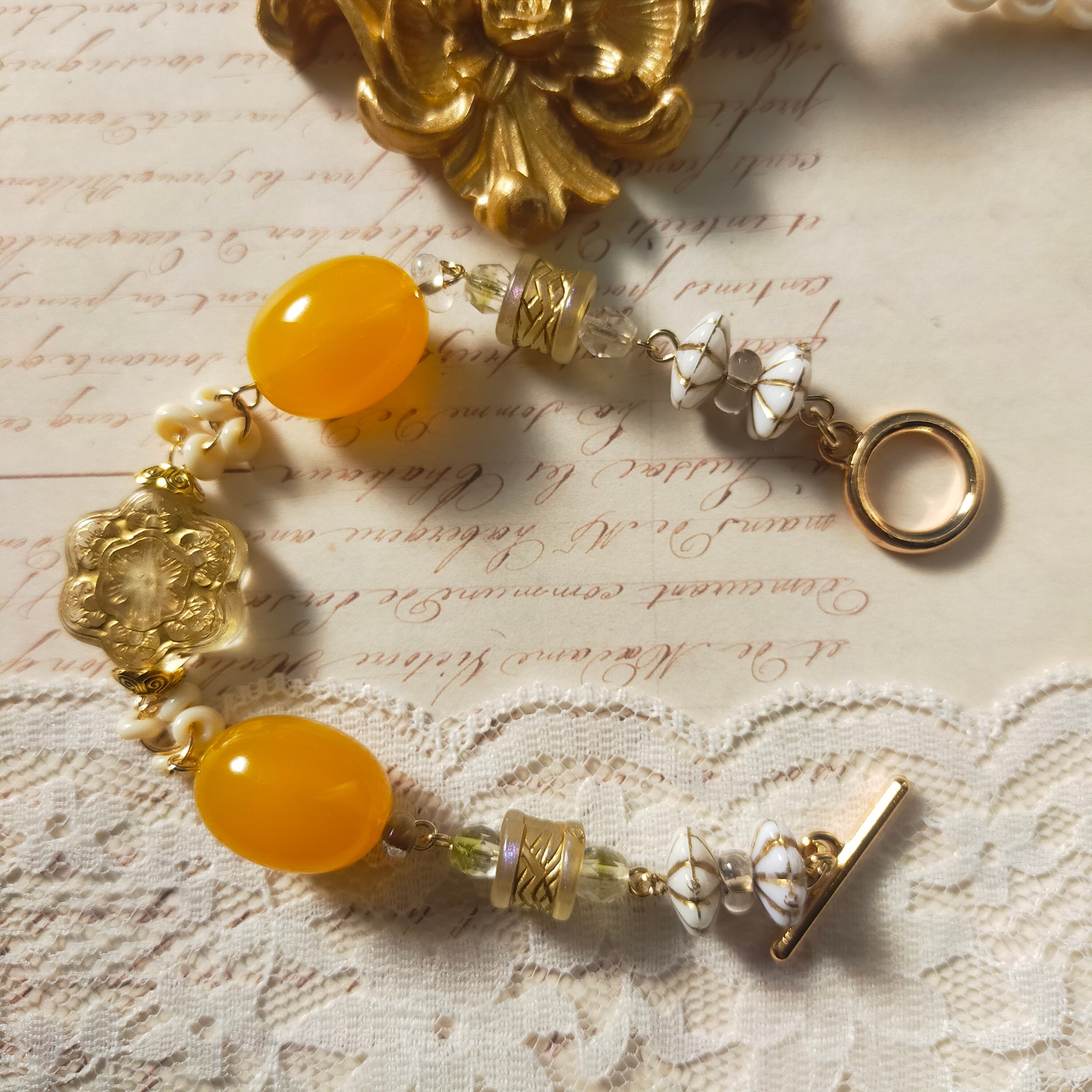 此方はいつもお世話になっている作家さんからお譲り頂いた染めビーズと硝子ビーズ、日本製ビーズ、金属製パーツ、アクリルビーズ、チェコビーズを使用したブレスレットです。