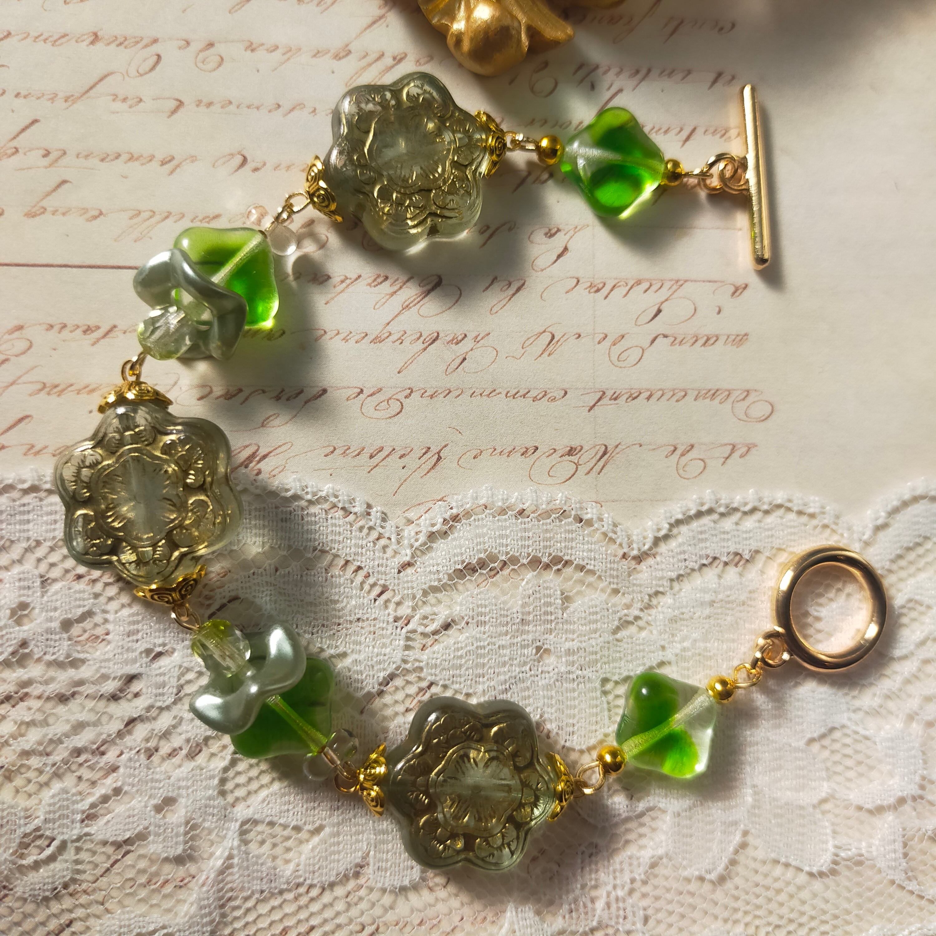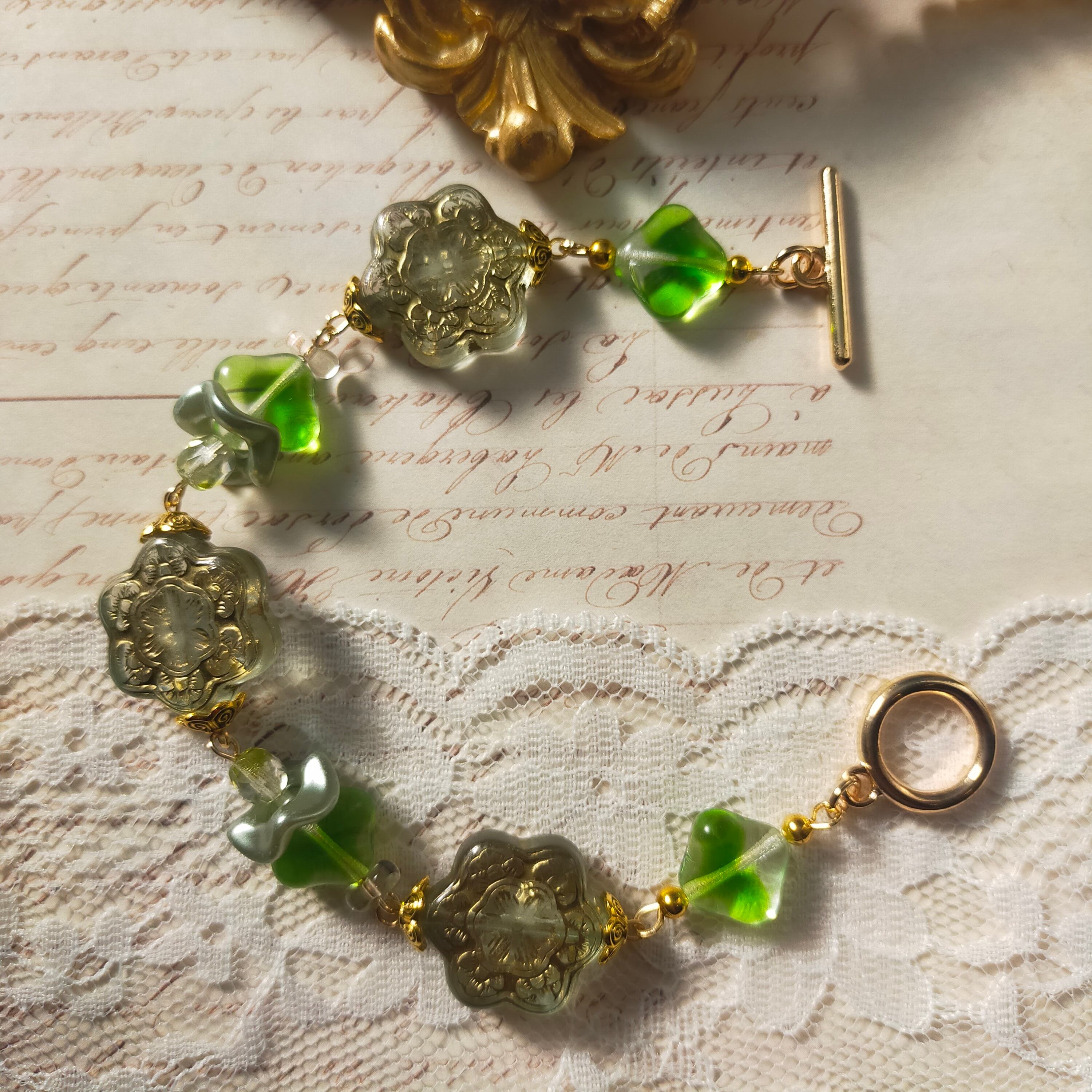 此方はいつもお世話になっている作家さんからお譲り頂いた染めビーズ、金属製パーツ、アクリルビーズ、チェコビーズを使用したブレスレットです。