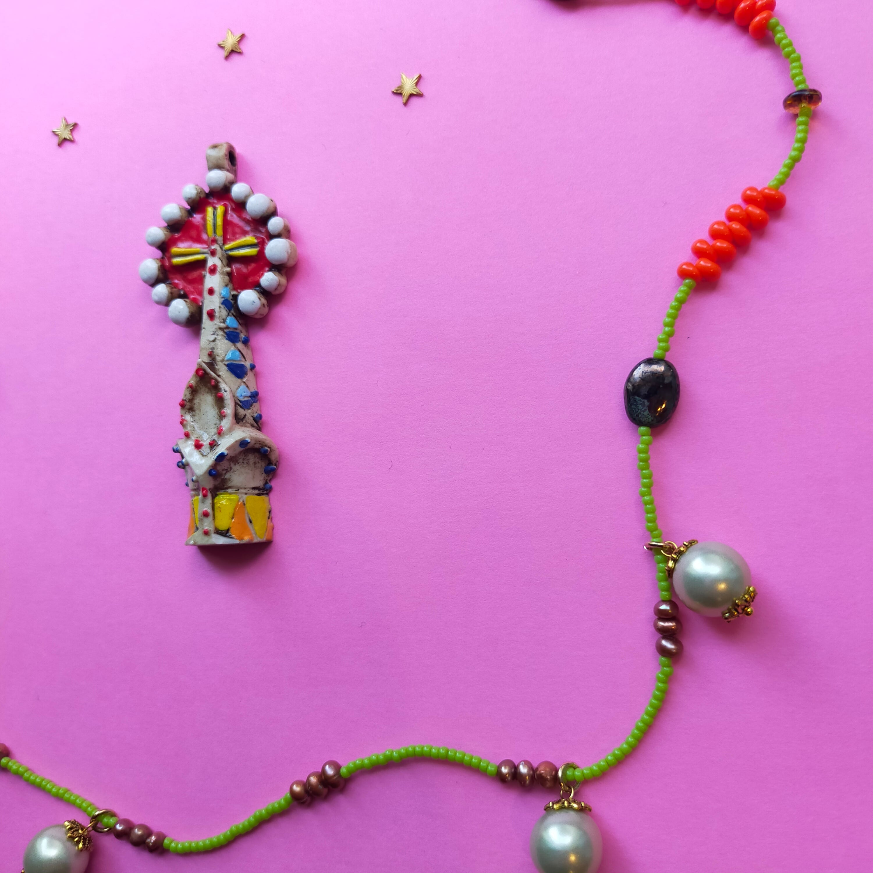 勾玉ビーズ、japan vintageの樹脂パール、チェコビーズ、淡水パール、金属製パーツを使用したNecklaceでございます。チェーンは真鍮。
