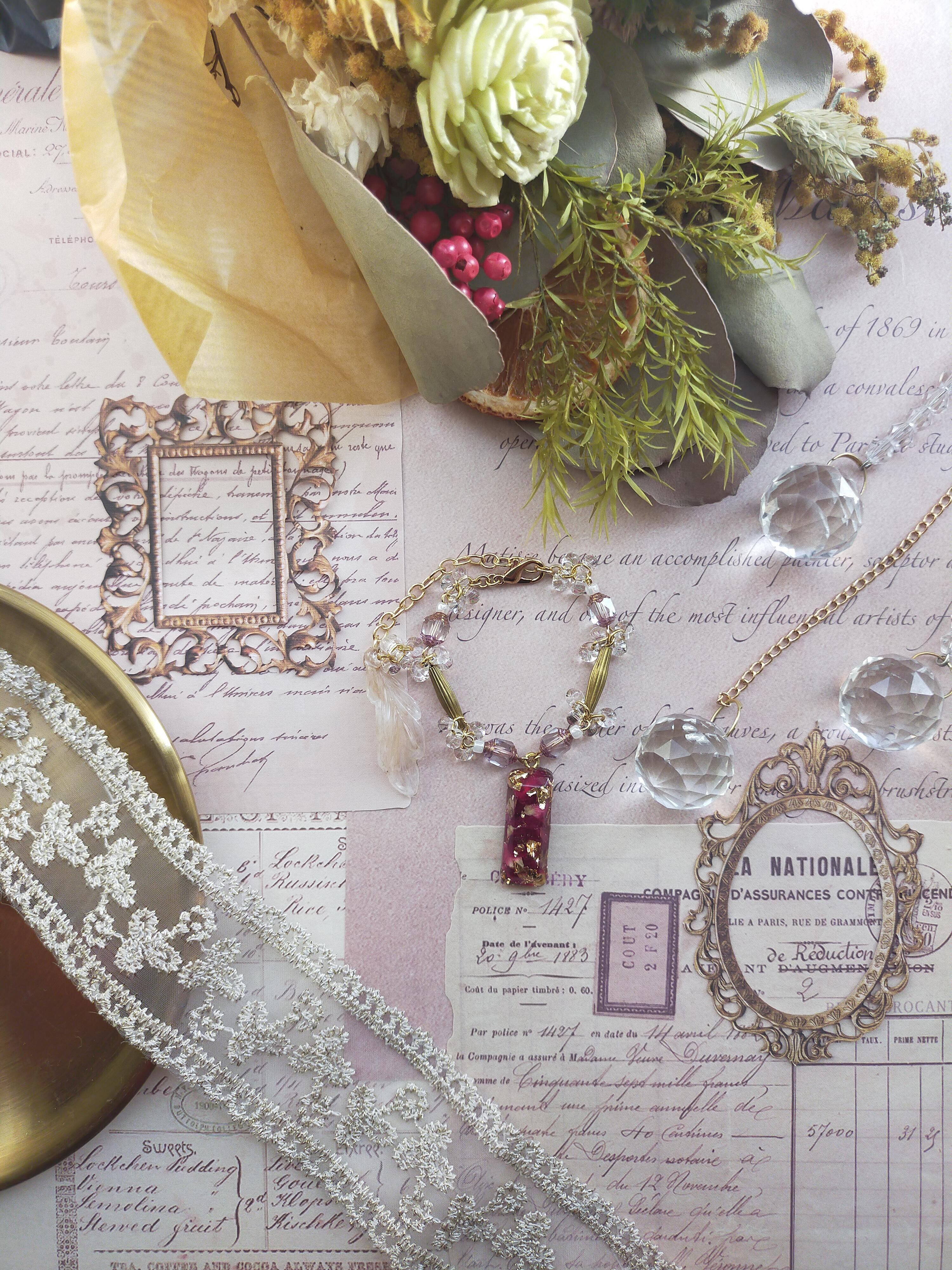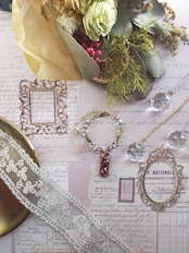 まんまる商会さんの赤いミニバラにゴージャスな金を封入したチャーム。そのまわりを真鍮とチェコビーズで配しました。アジャスター部分も真鍮で纏めました。