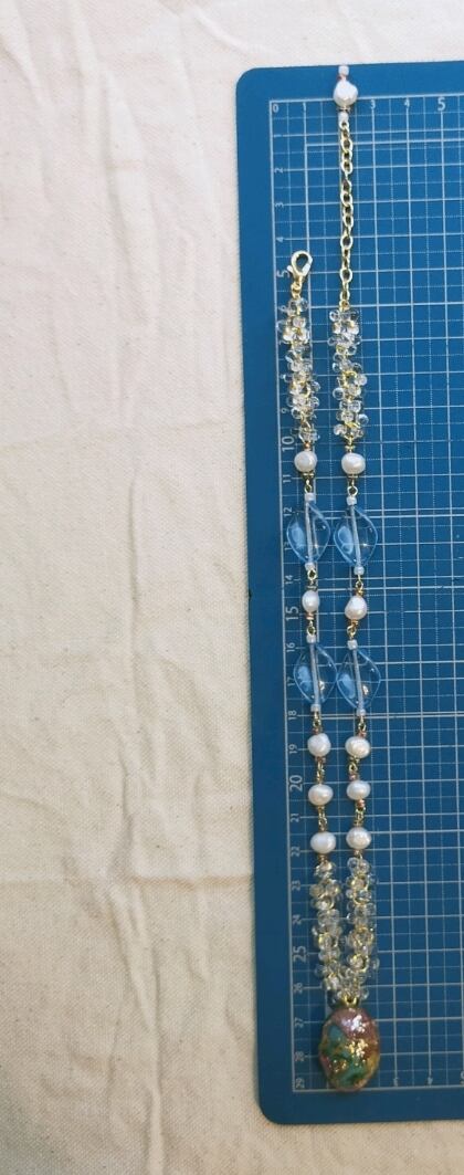ファルファーレチェコビーズと淡水パーツをふんだんに使用し、アジャスター部分は真鍮を使っております。