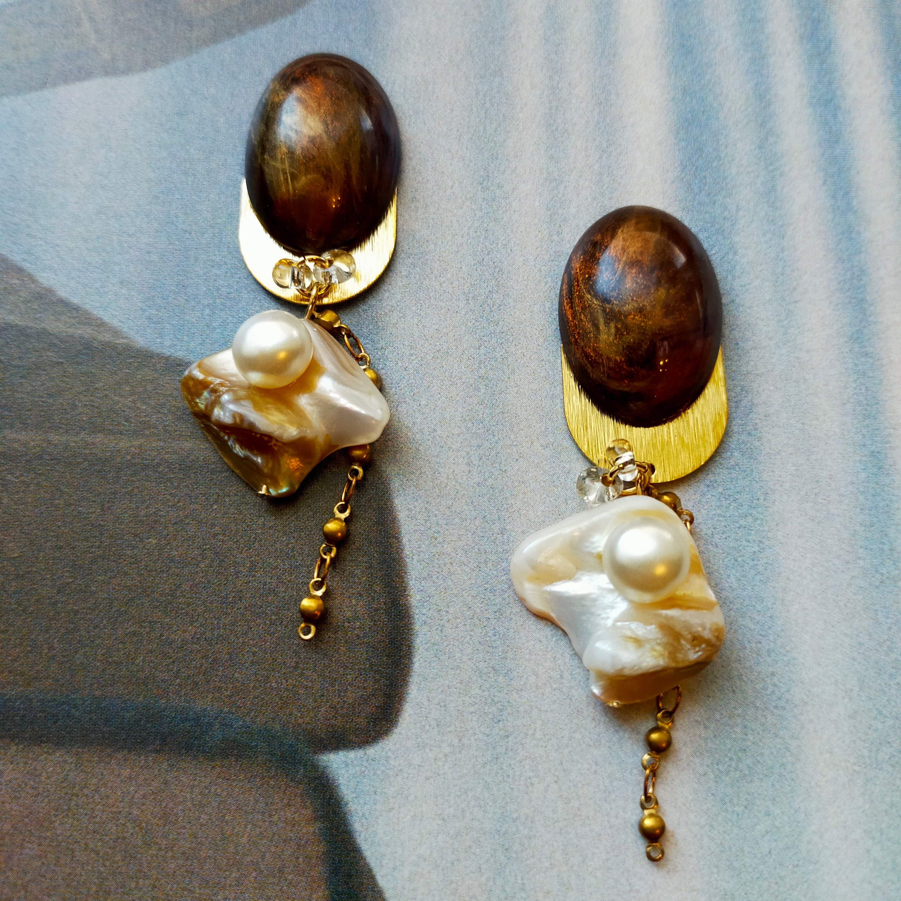 こちらはアクリルカボション、真鍮、シェルの上にアクリルのパールを乗せて、後に真鍮のチェーンをつけました。