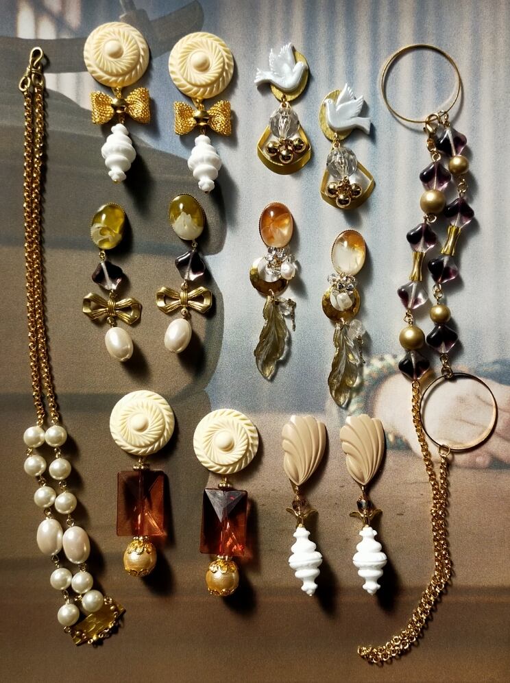 此方は上から1980年代のドイツ製のもので、真鍮のリボンにアメリカヴィンテージのアクリルパーツを使用しております。