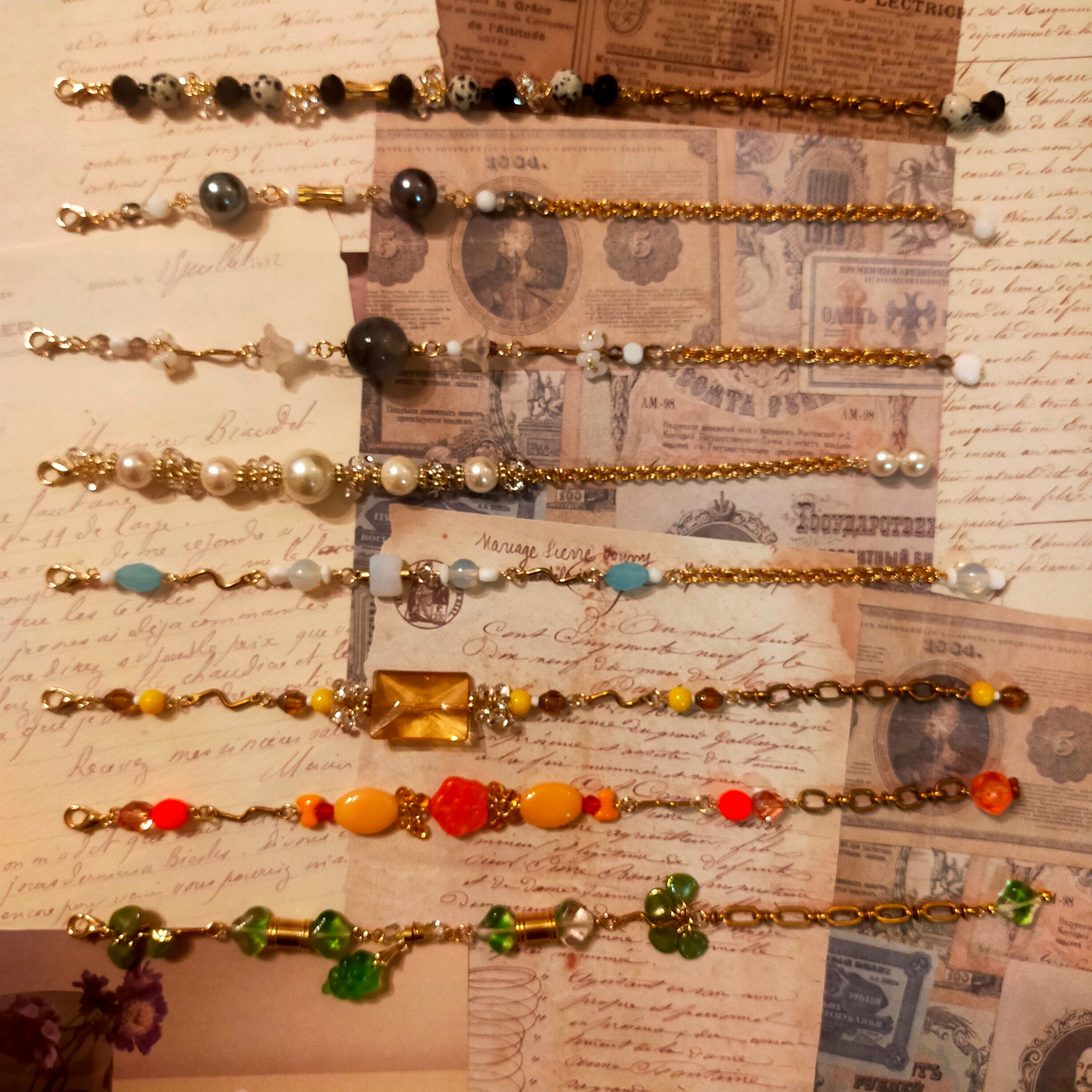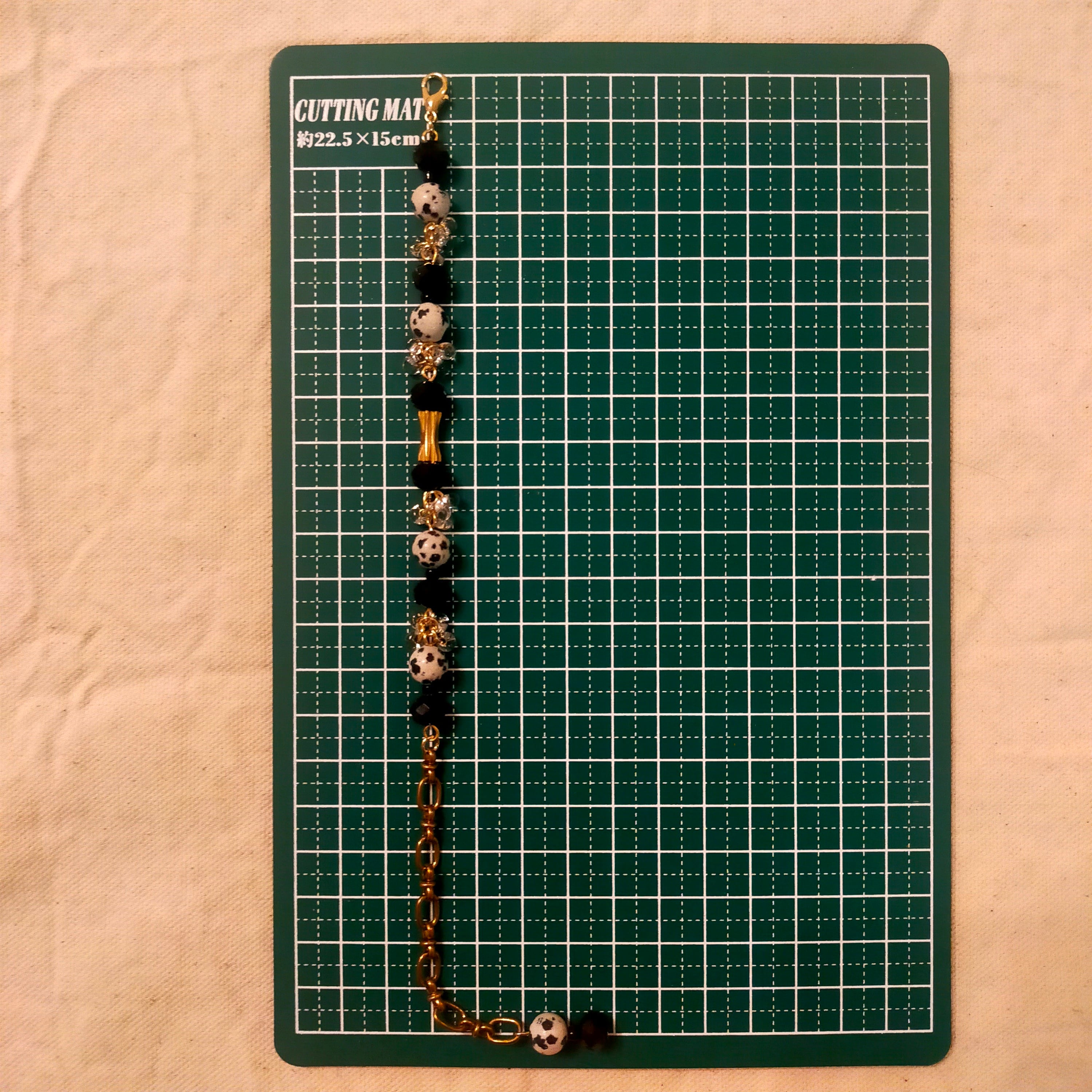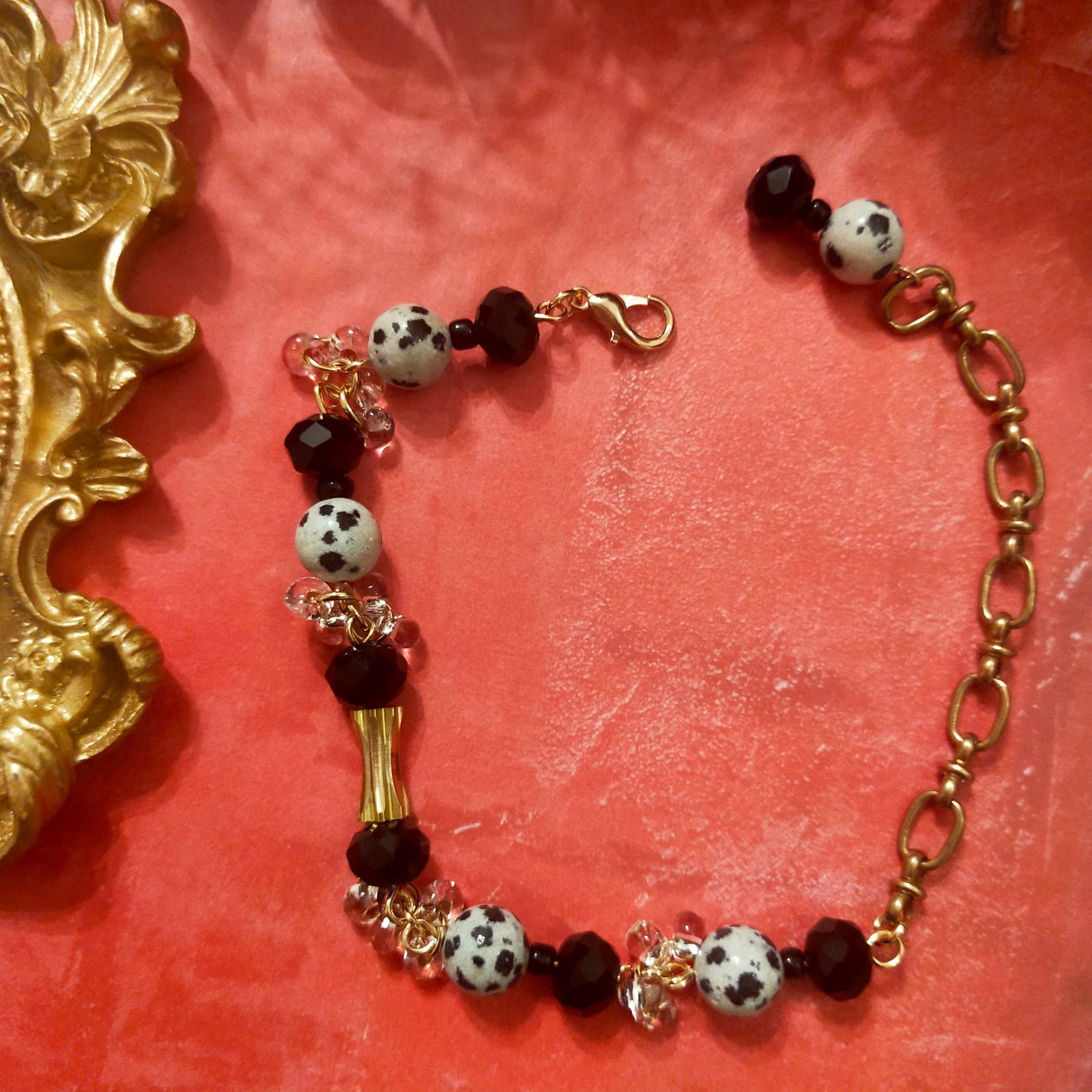 此方はダルメシアンジャスパー、ガラスビーズ、真鍮、勾玉ビーズ、を使用しております。