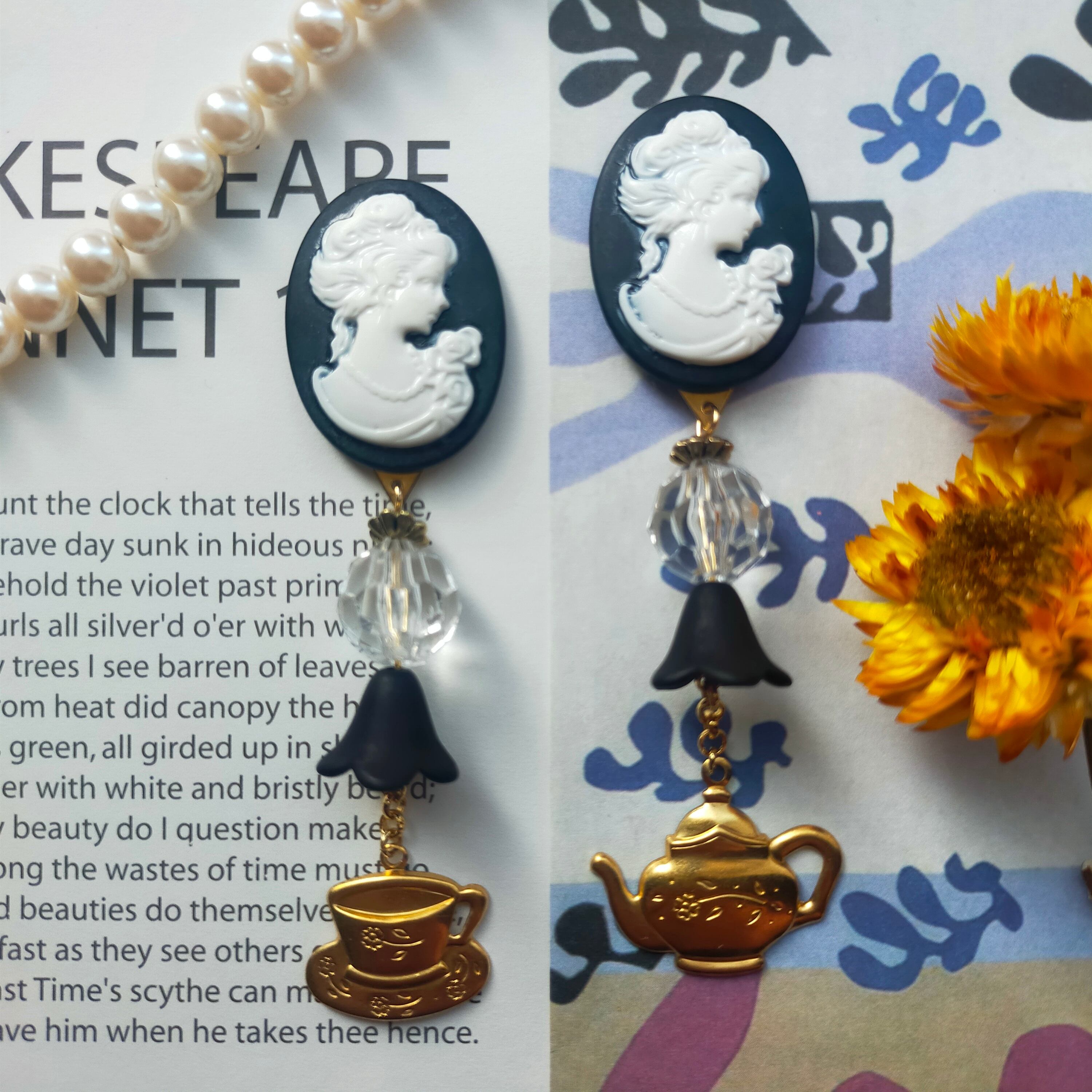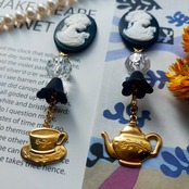 此方は上からアメリカンボタンのカメオ風、クリアアクリルビーズ、黒いアクリルのお花、真鍮のチェーン、アメリカから来た真鍮を使用しております。