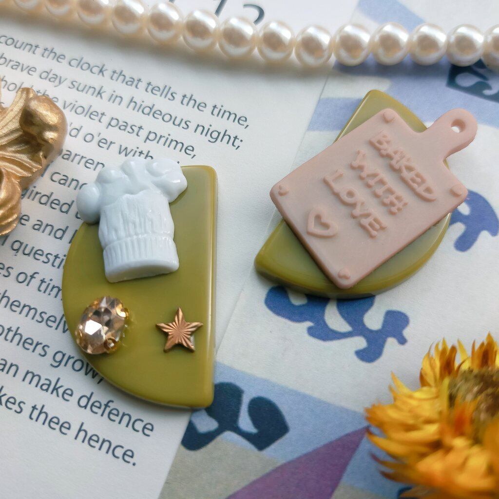 此方は半月のアクリルパーツの上にアメリカンボタンのコック帽とカッティングボード、ビジュー、真鍮の星を貼り付けました。