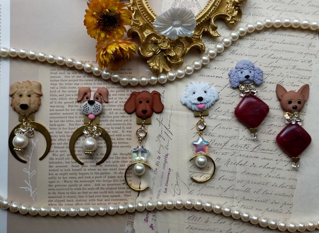 アメリカンボタンの犬ちゃん、真鍮、硝子の勾玉ビーズ、アクリルパーツ、ハートの真鍮、クリアビーズ